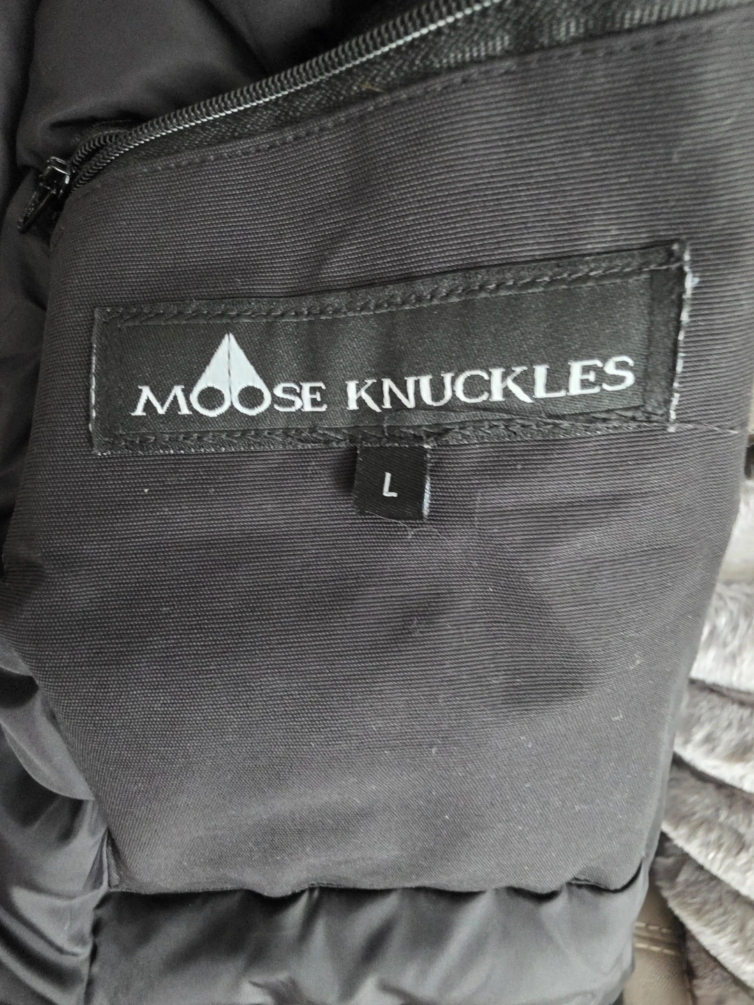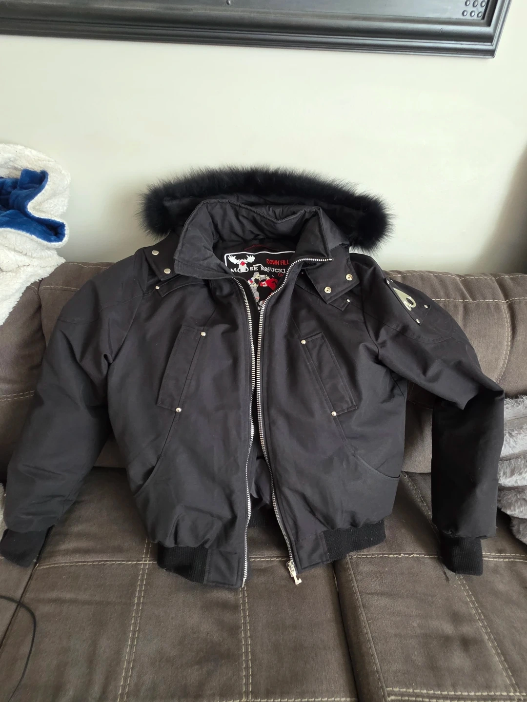 Black Moose Knuckles bomber jacket.