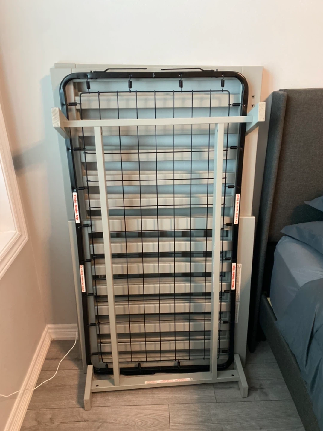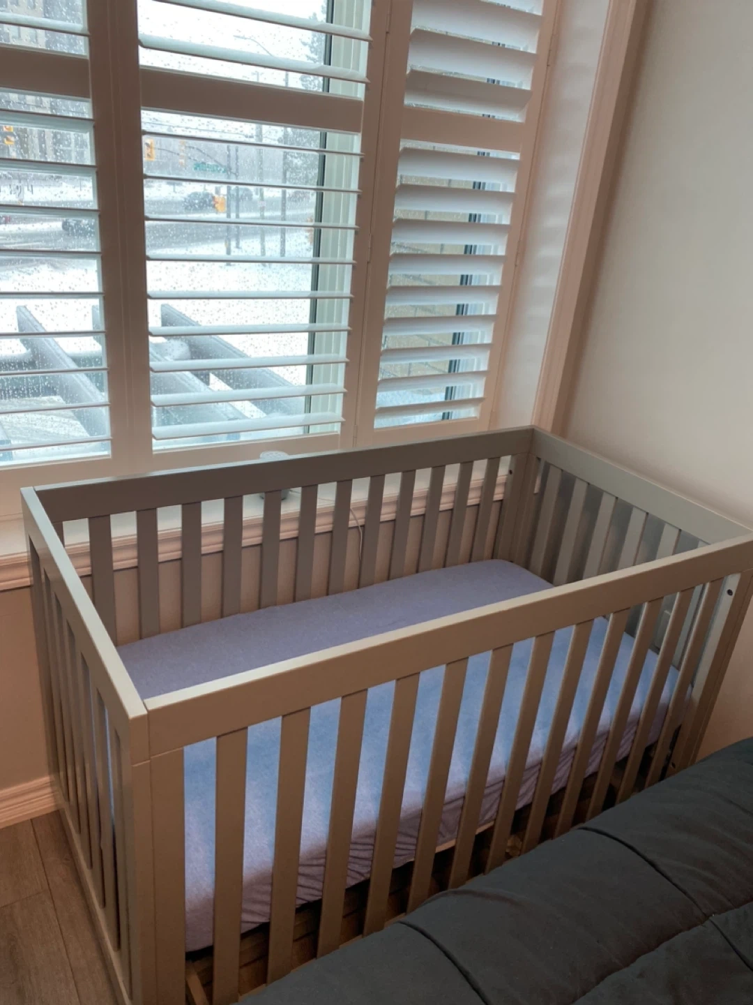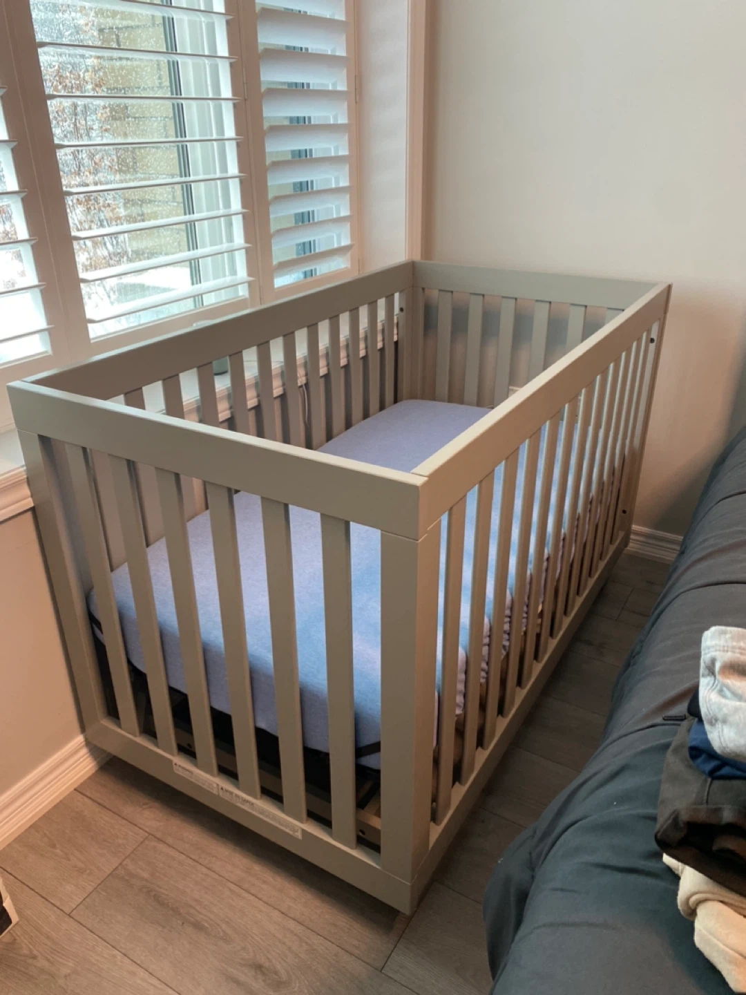 Storkcraft Beckett convertible crib in Pebble Gray. Converts from crib to toddler bed and daybed. Includes mattress support with adjustable positions. Solid wood construction.