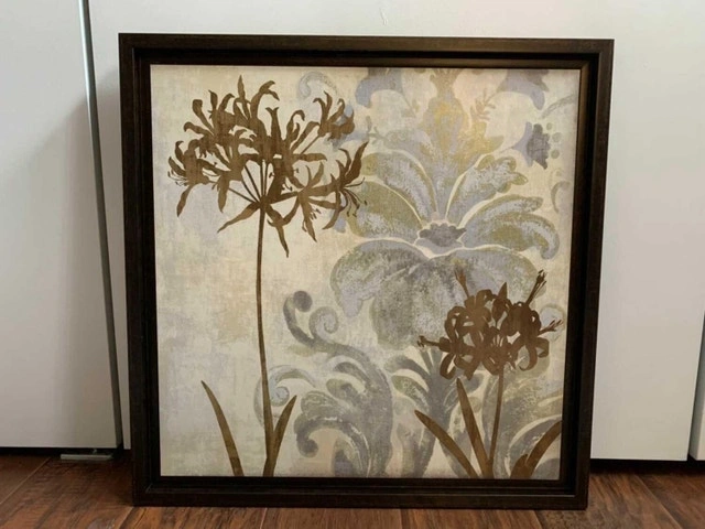 Lovely dark bronze frame, raised middle panel with colourful flowers art (no glass). Smoke and pet free home. Excellent condition, heavy 22” square. Pretty black frame, raised middle panel with flower art (no glass). Excellent condition, heavy 22 1/4” square approx. Purchase both and save! Pick up in Keswick. Used for staging. Or Best Offer.