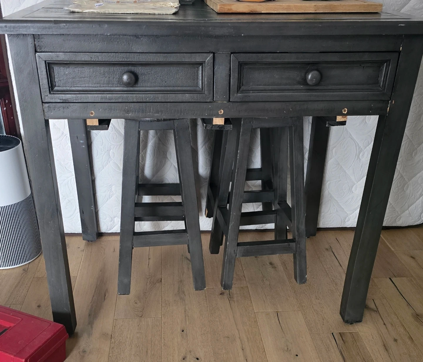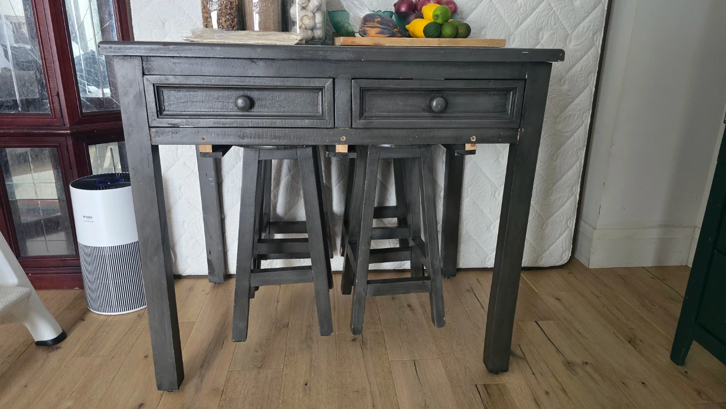 This is a dark grey bar table set with four stools. It features two drawers on each side for storage. The table has a rustic charm, and it's perfect for a small dining area or kitchen nook.