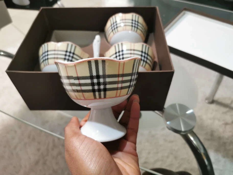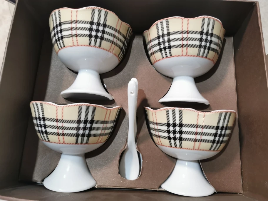 Four elegant dessert bowls, unique design. Matching spoons included. Perfect for serving ice cream or other treats.