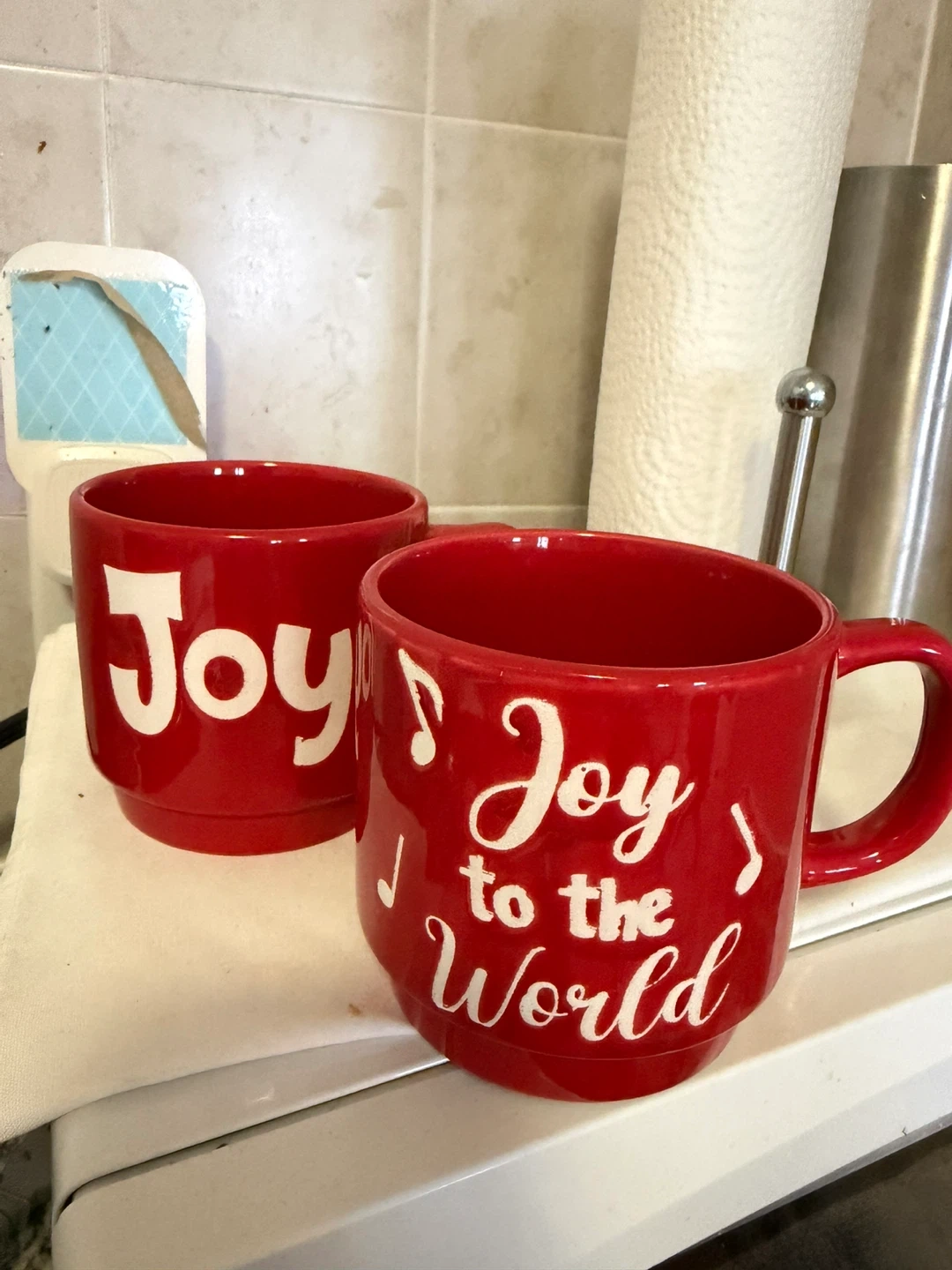 Selling a set of two red mugs! One mug says "Joy" in white lettering, and the other says "Joy to the World" with musical notes. Perfect for adding a festive touch to your morning coffee or tea!