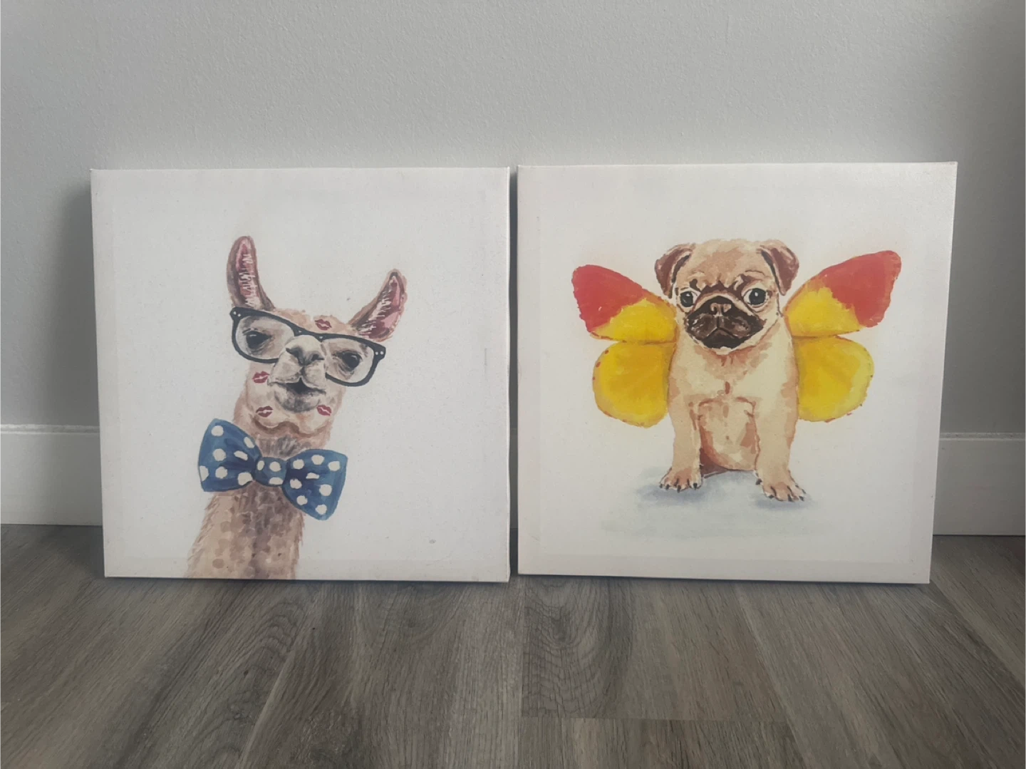 Two cute canvas prints featuring a llama with glasses and bow tie, and a pug with butterfly wings.