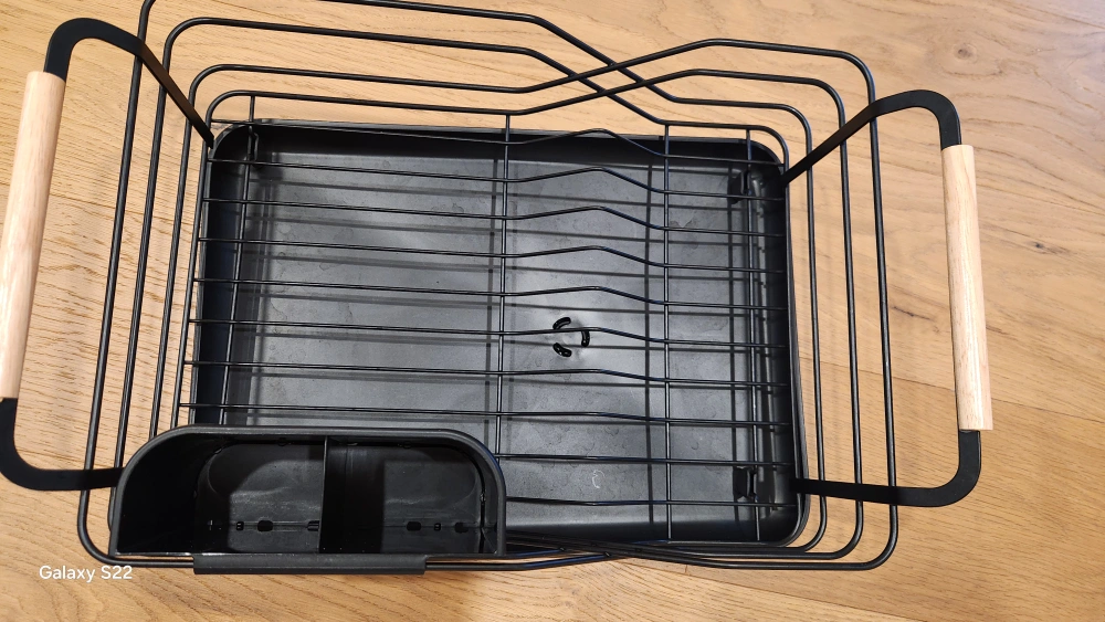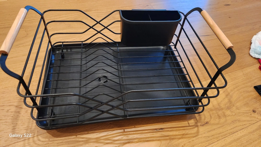Selling a black metal dish rack with wooden handles. It's in great shape and ready to help keep your kitchen organized! Includes a utensil holder.