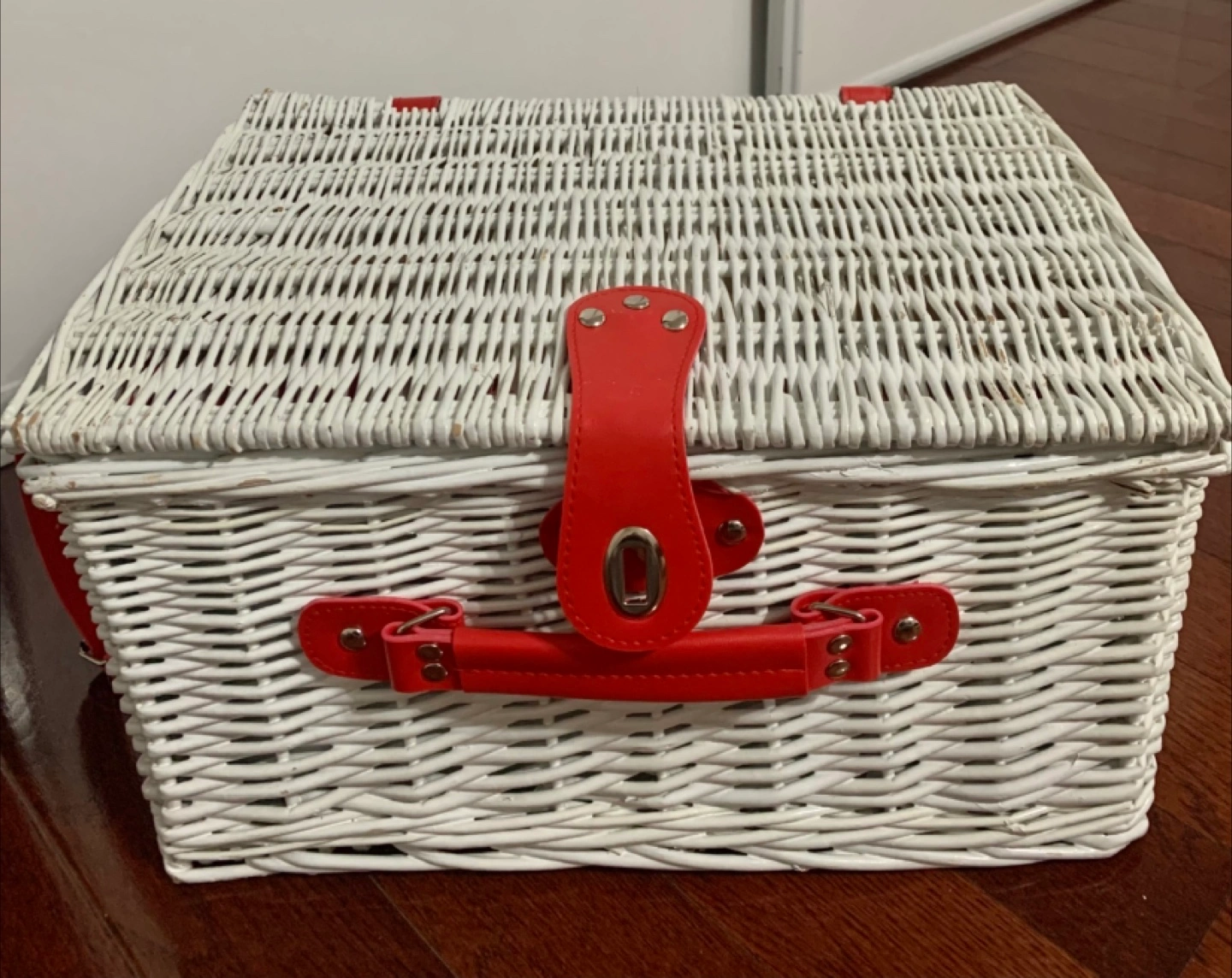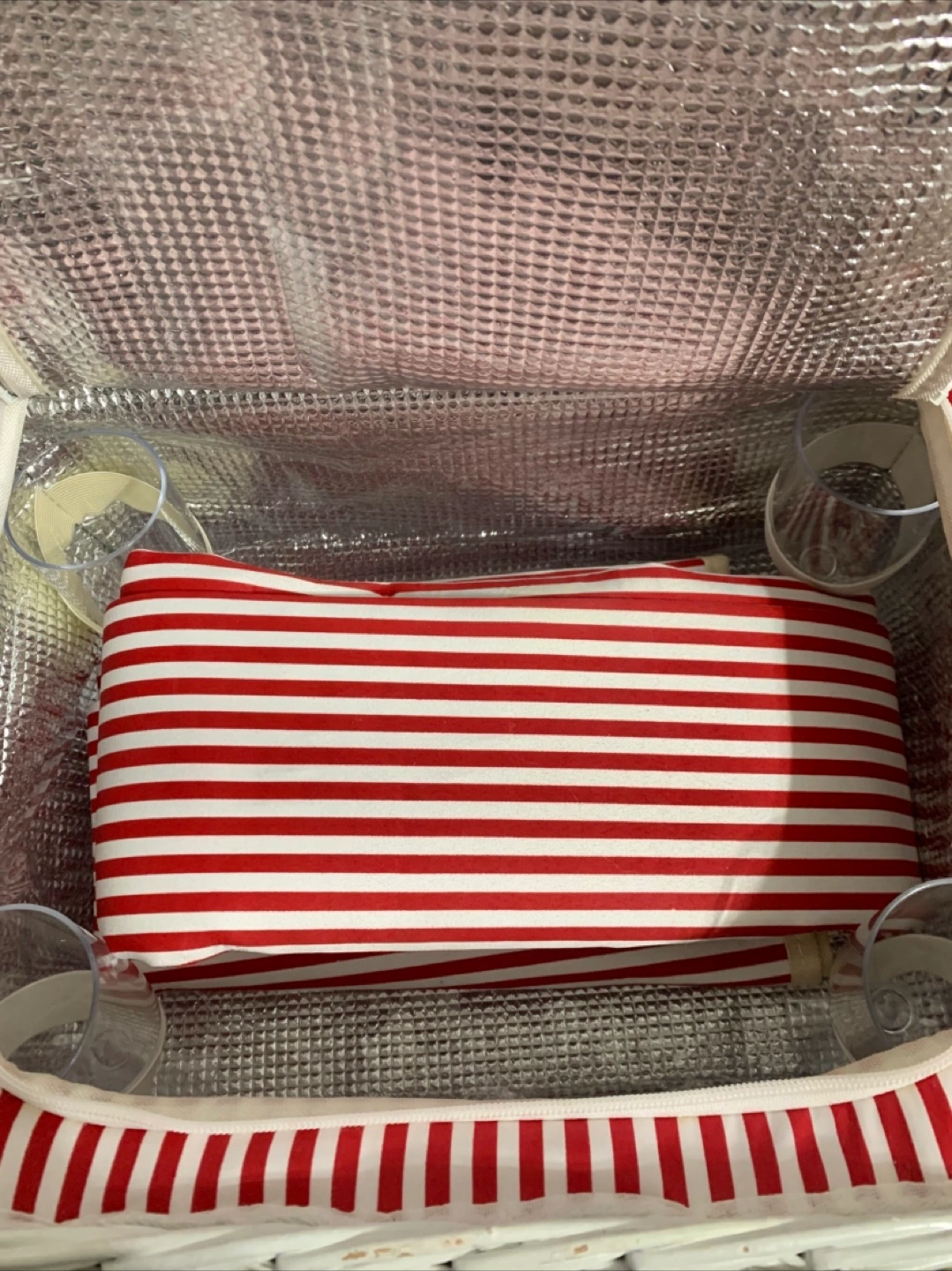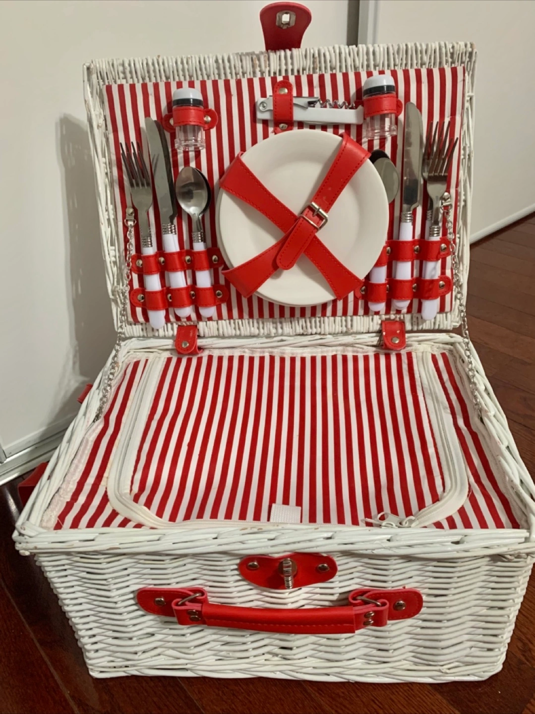 This classic white wicker picnic basket features a charming red and white striped interior lining. It includes a set of cutlery, plates, and cups, perfect for outdoor meals. The insulated compartment helps keep your food fresh. Also comes with a picnic blanket. A great way to enjoy a meal outdoors!