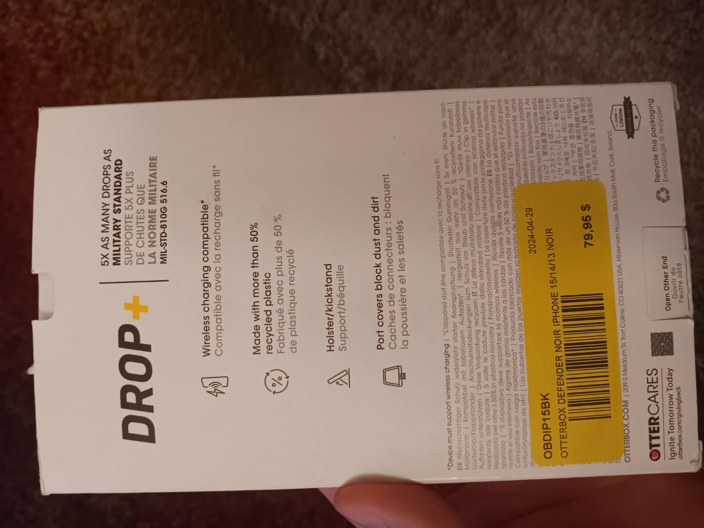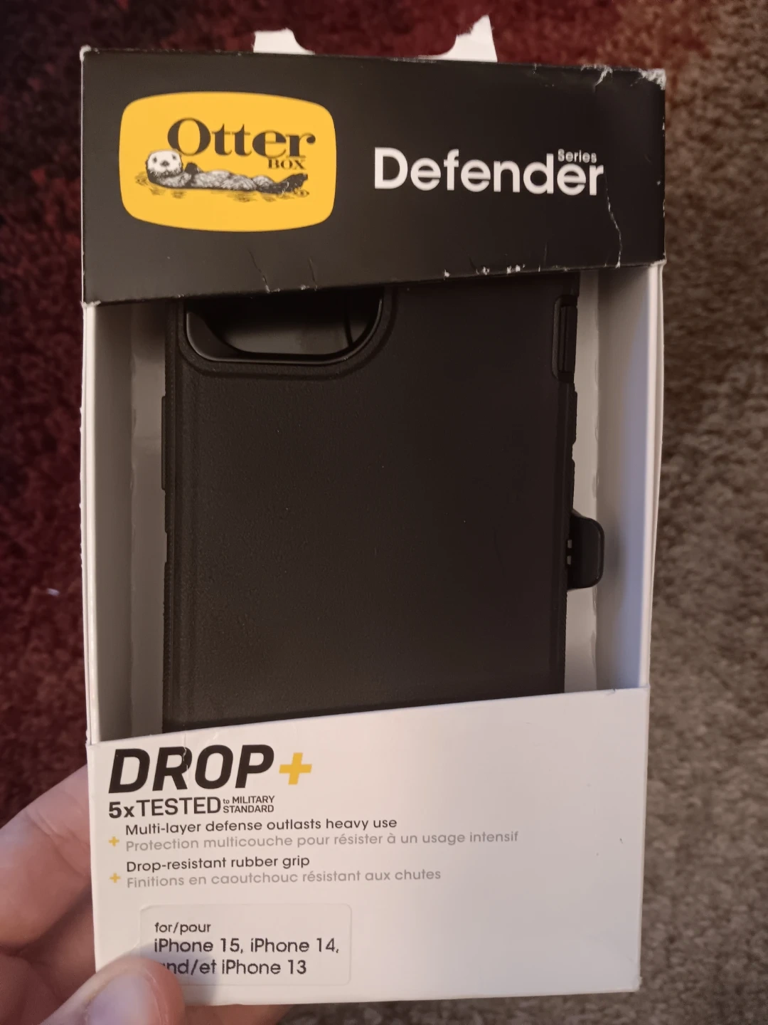 OtterBox Defender Series case for iPhone 15, 14, and 13. Includes a drop-resistant rubber grip and port covers.