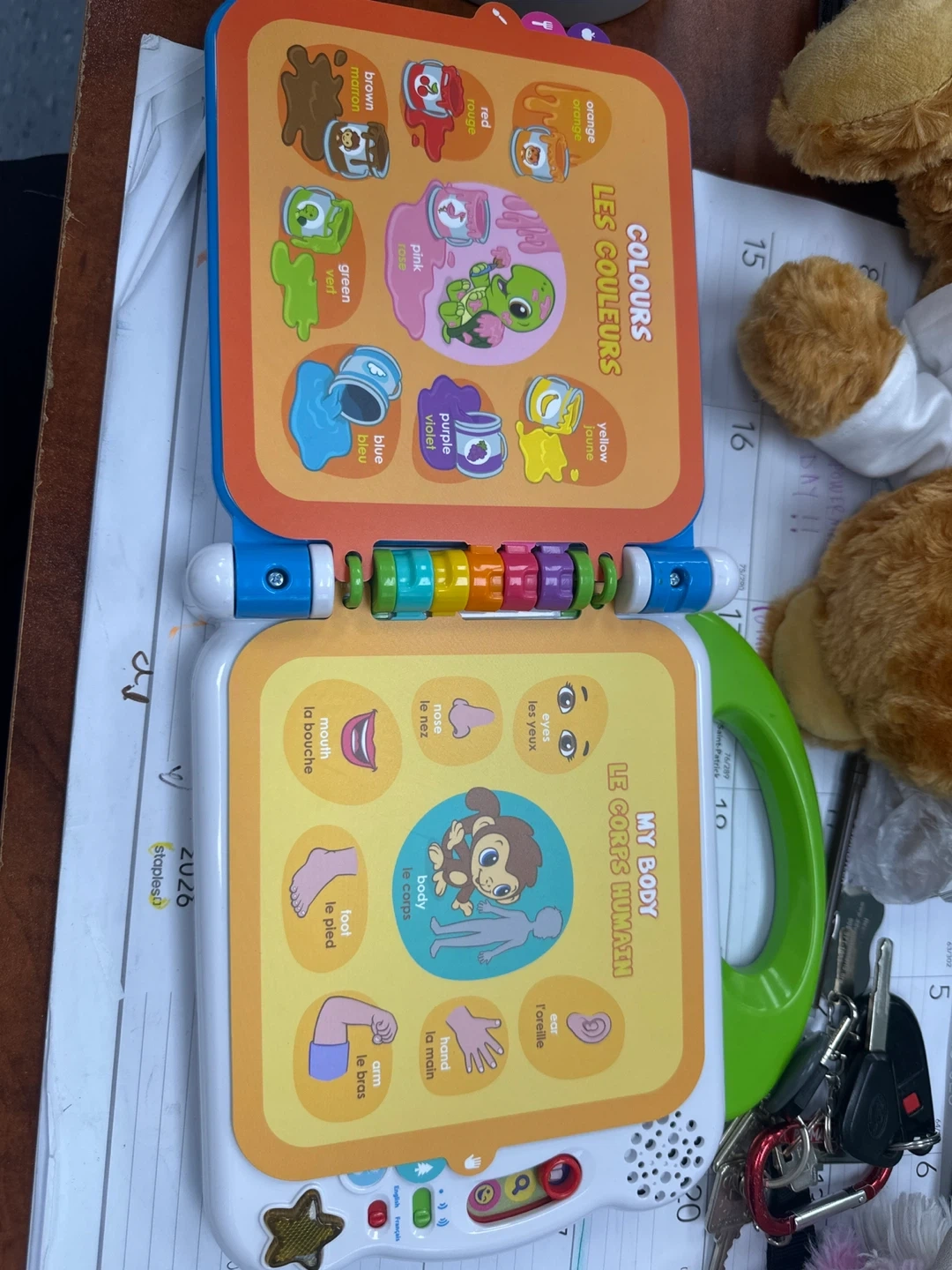This LeapFrog Learning Friends 100 Words Book is designed for young learners. It features various topics like colours, animals, and vehicles. It's bilingual, offering content in English and French for expanded learning. This interactive book helps introduce new vocabulary in a fun way!