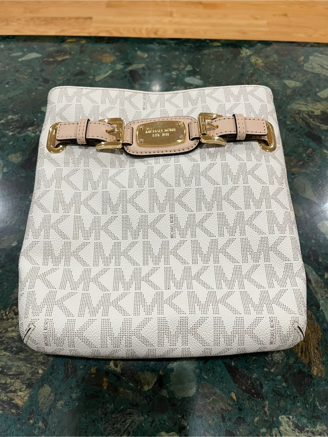 I'm selling a Michael Kors shoulder bag. It features the signature MK logo print all over. This stylish bag is perfect for everyday use!