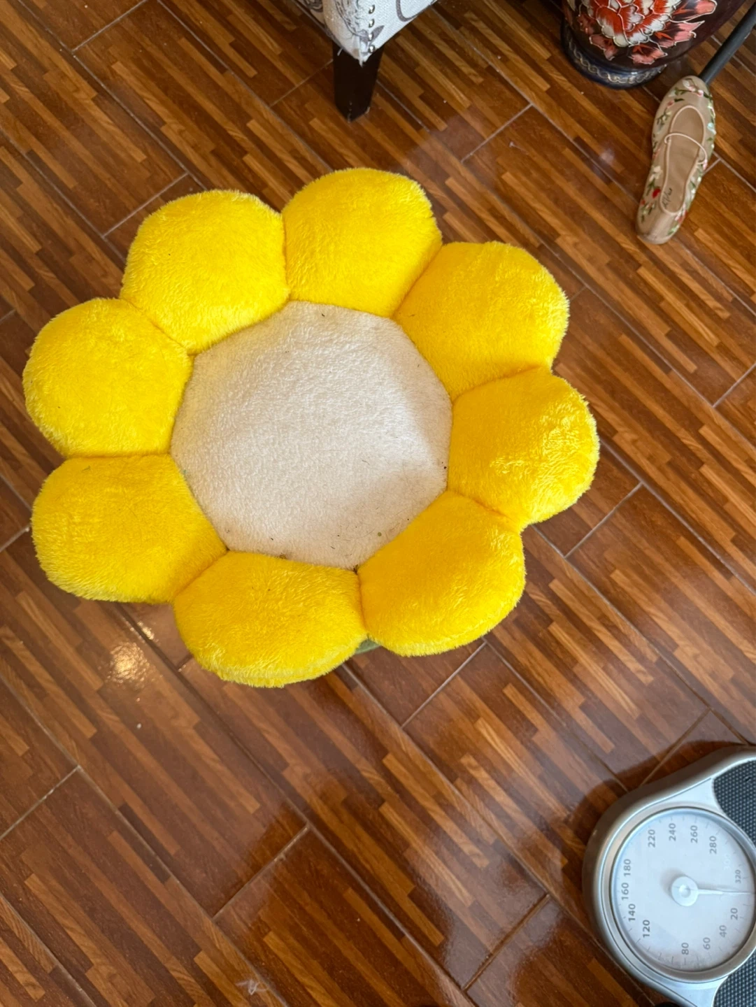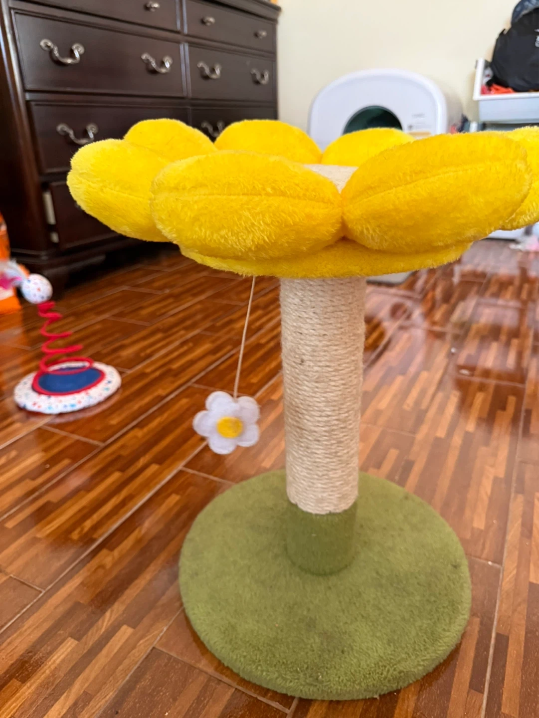 This cute scratching post is shaped like a flower. It features a plush yellow design and a sisal rope-wrapped post for scratching. A dangling toy with a flower detail is attached for extra fun. It's a great addition to your cat's play area!