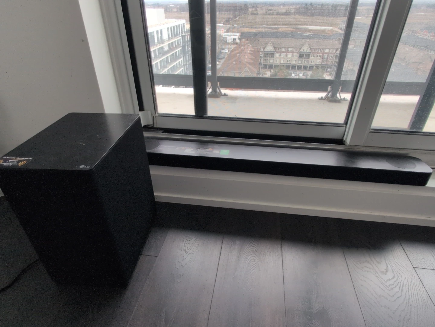 LG Sound Bar SP8YA with Meridian audio technology. Features Dolby Atmos and DTS:X support. Includes a subwoofer for enhanced bass. Compatible with Apple AirPlay and Google Assistant.