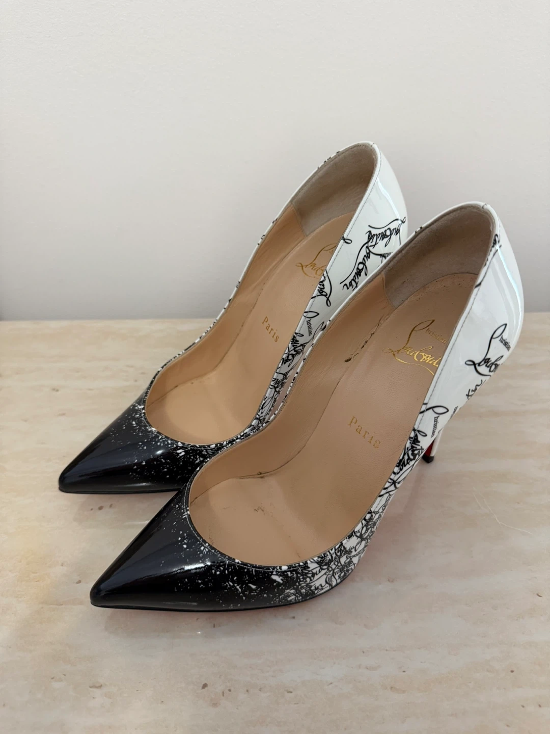 These Christian Louboutin heels feature a striking white and black map print. Made with a patent leather finish, they showcase the iconic red sole. They're a stylish choice for any occasion!