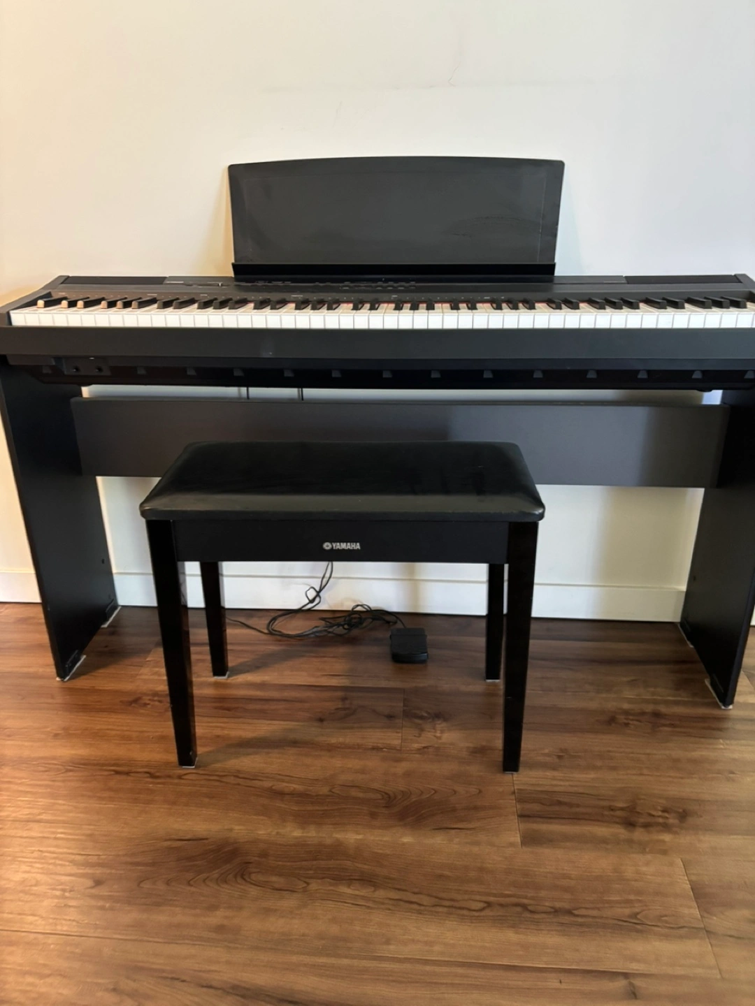 Selling a Yamaha P-105 digital piano in great condition! This comes with a stand and a bench, so you'll have everything you need to start playing. Perfect for beginners or experienced players alike. It's a great instrument for anyone looking to enjoy playing the piano at home!