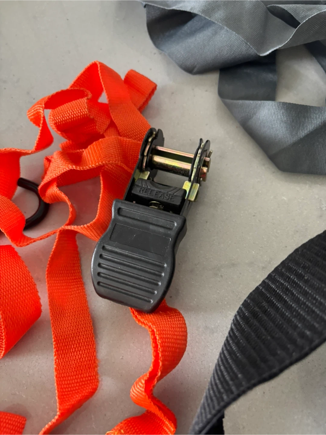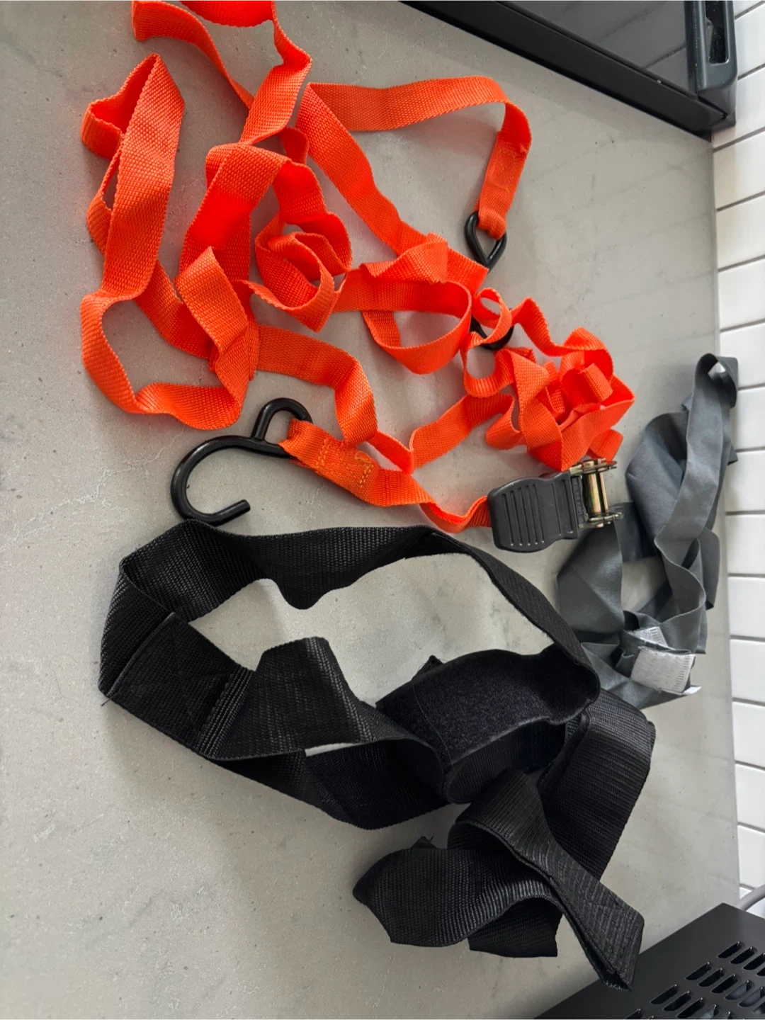 Two sets of tie-down straps, one orange and one grey, with ratchet mechanism. Includes a black hook strap. Strong and durable for securing loads.pick up 551 Emerson street. Coquitlam. From smoke free pet free home . Cash only . No delivery. No e-transfer.