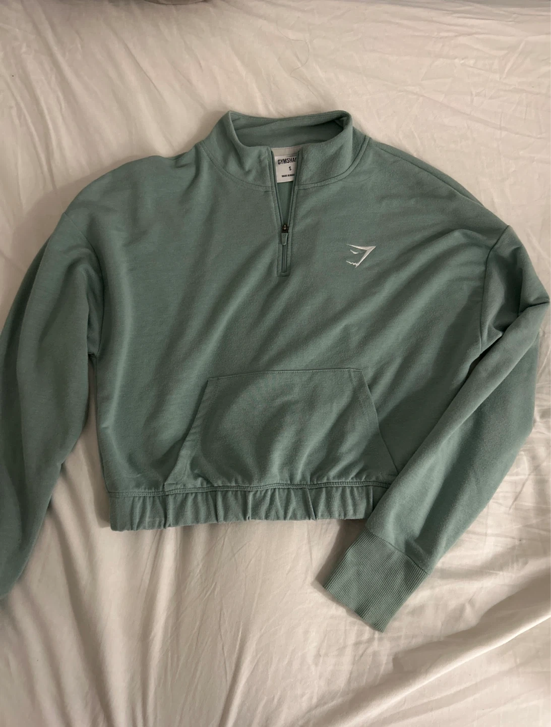 This is a teal Gymshark quarter zip cropped sweatshirt. It's a size small and features a front pocket. Material is a soft cotton blend.