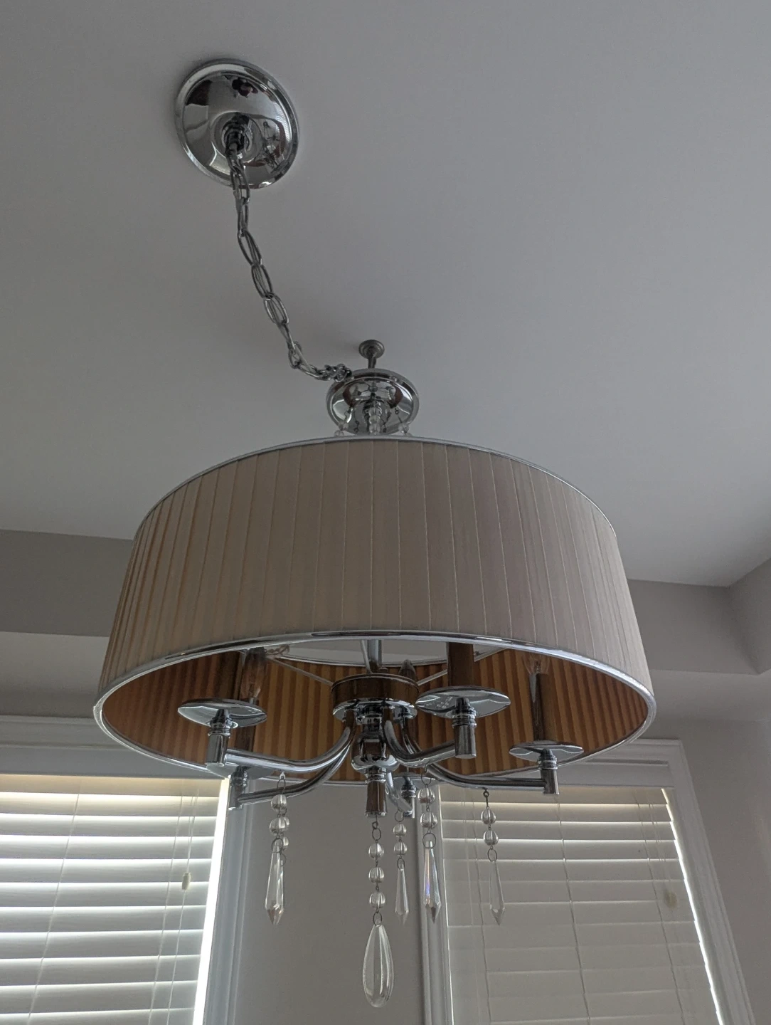 A stylish chandelier featuring a pleated fabric shade and sparkling crystal drop accents. It's designed with a chrome finish and provides ample light. This fixture is perfect for adding a touch of elegance to a dining room or living area.