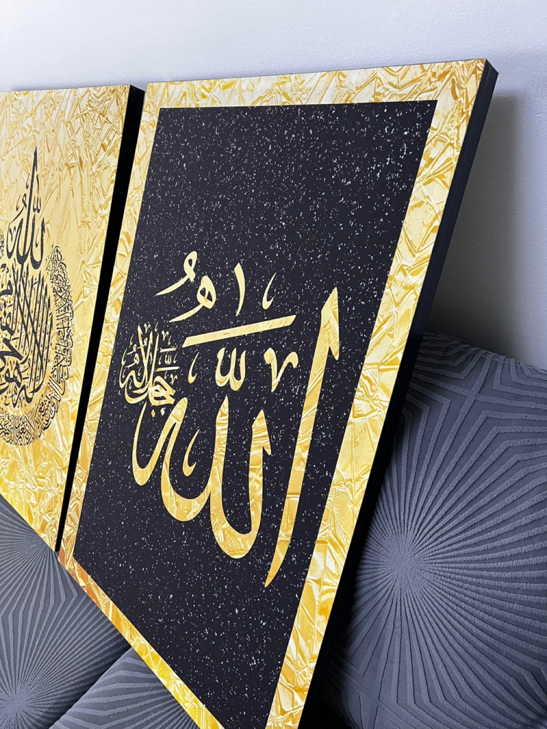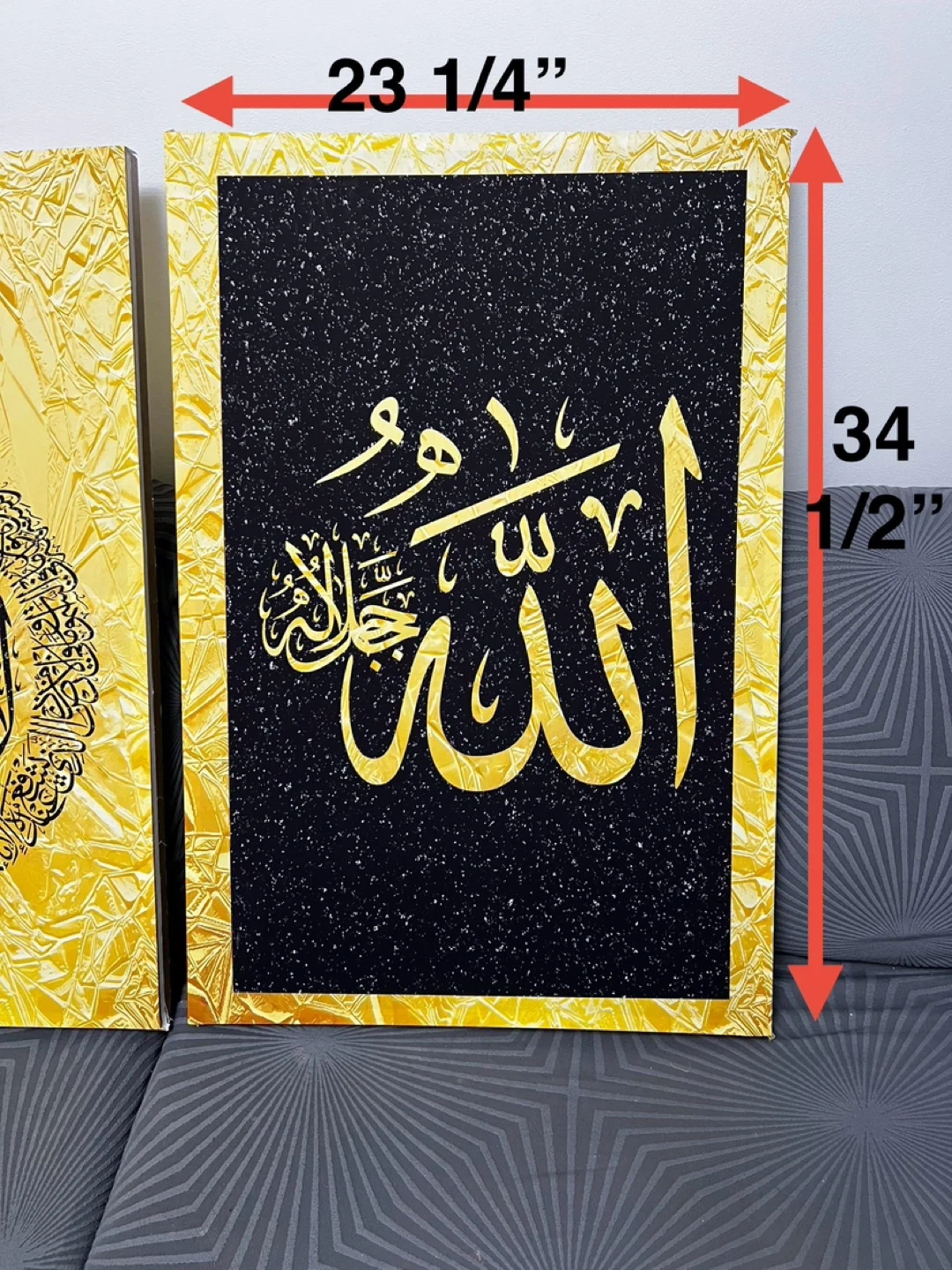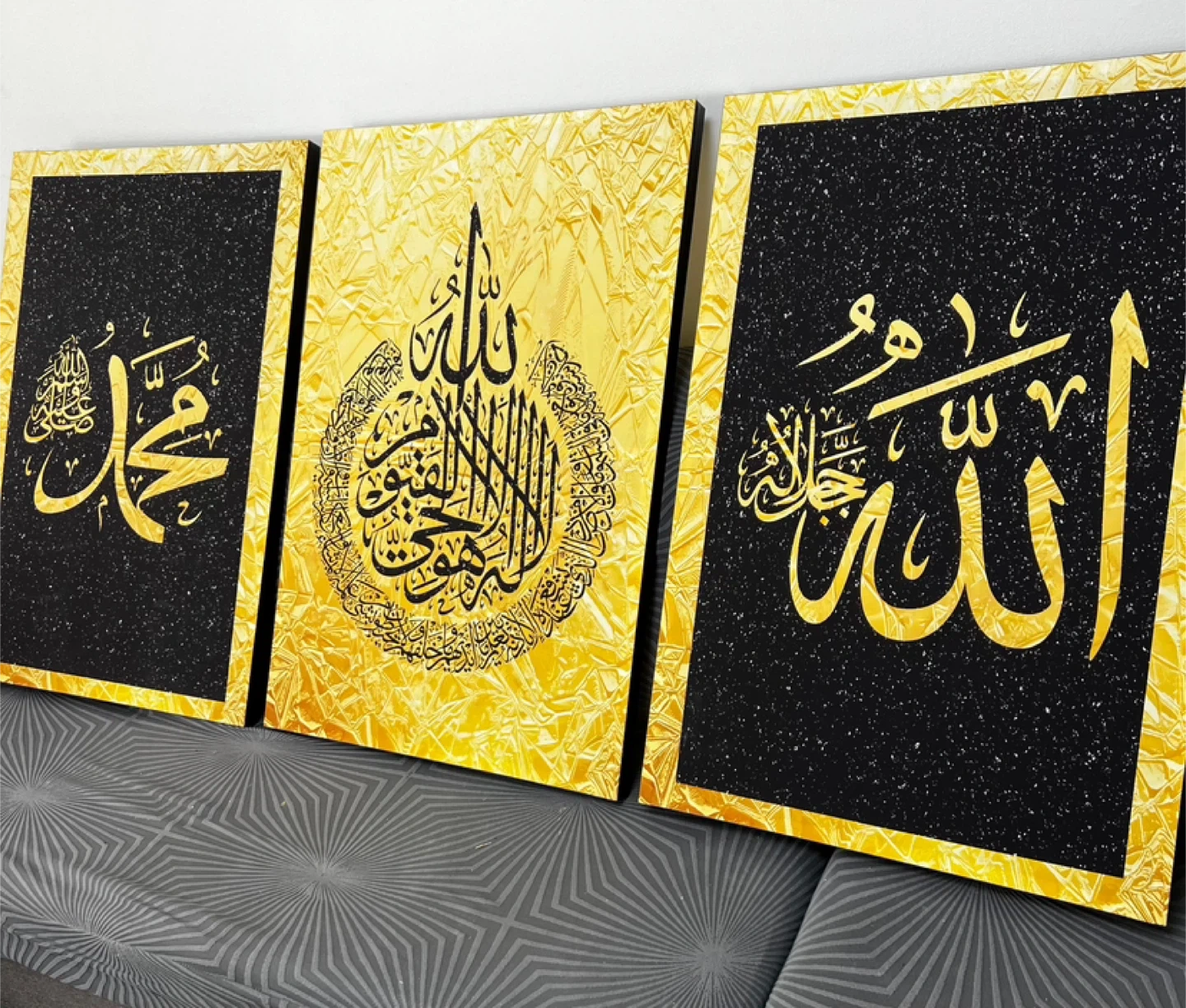 Set of three Islamic calligraphy art pieces featuring Arabic script. Two pieces have black backgrounds with gold speckles, and one features a textured gold background. Each piece measures 23 1/4" wide and 34 1/2" tall. Adds a decorative touch to any space! And perfect for Ramadan gift or Eid gift ☪️