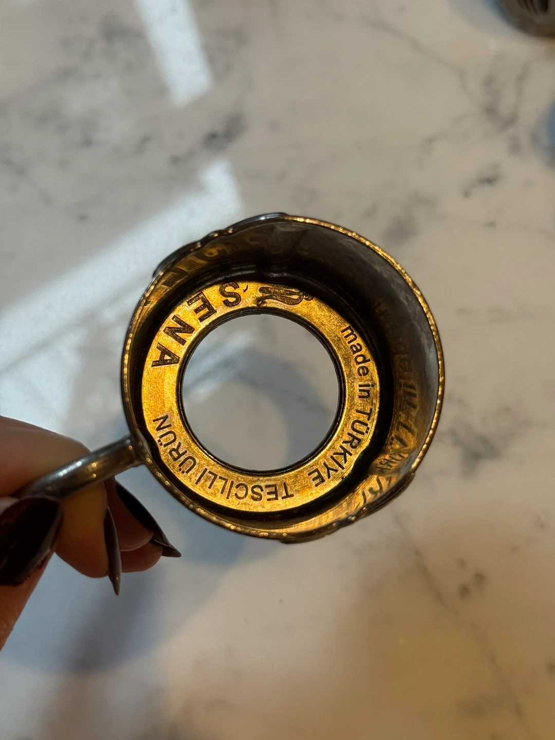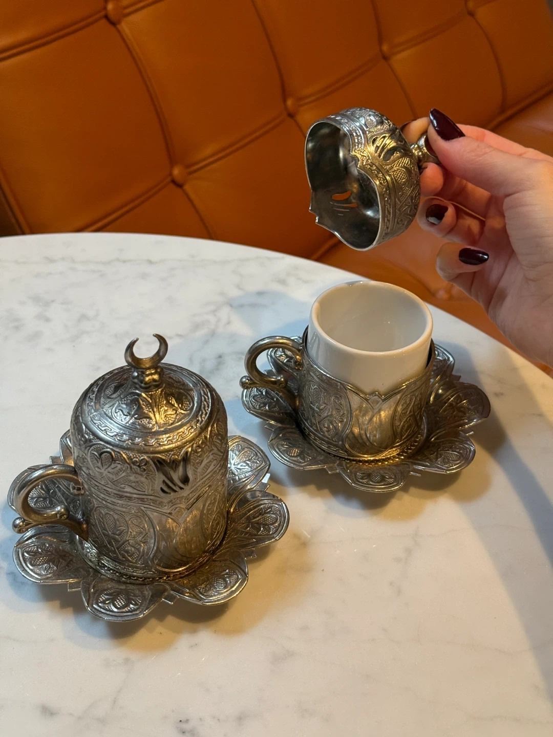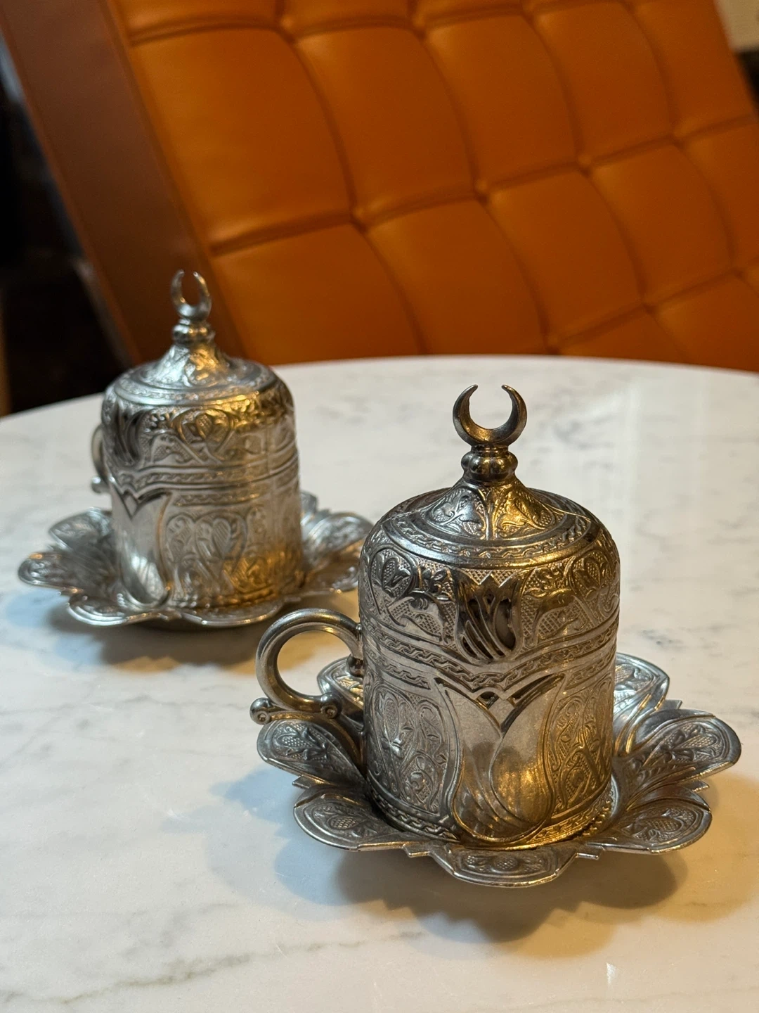 These two ornate Turkish coffee cups come with matching saucers and lids. They're crafted from metal with intricate embossed designs. The cups feature white ceramic inserts for drinking. A beautiful addition to any coffee lover's collection!