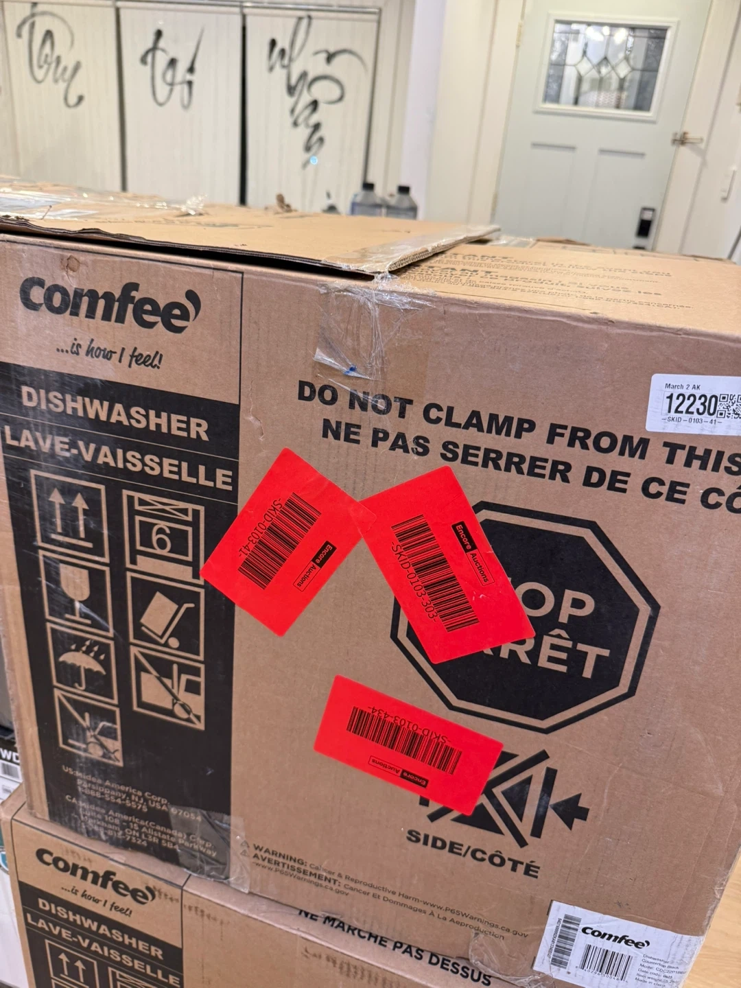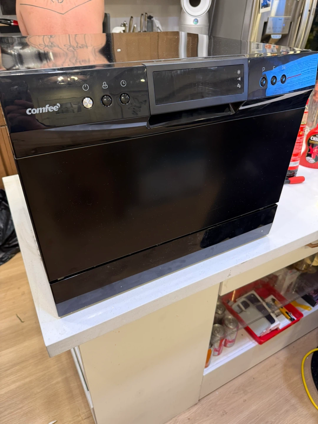 Brand new Comfee countertop dishwasher in black and white. It has 6 place settings and 8 washing programs. Includes original box and packaging.