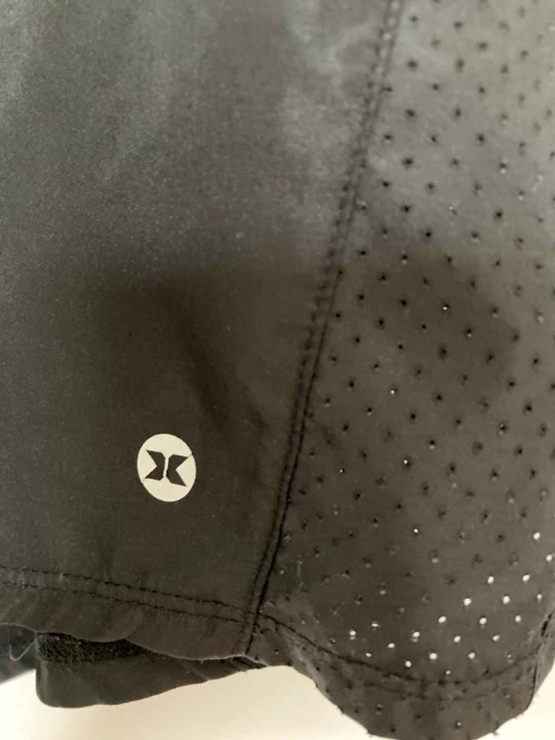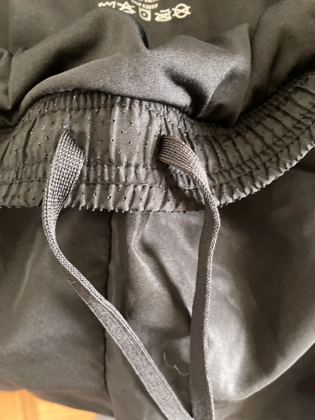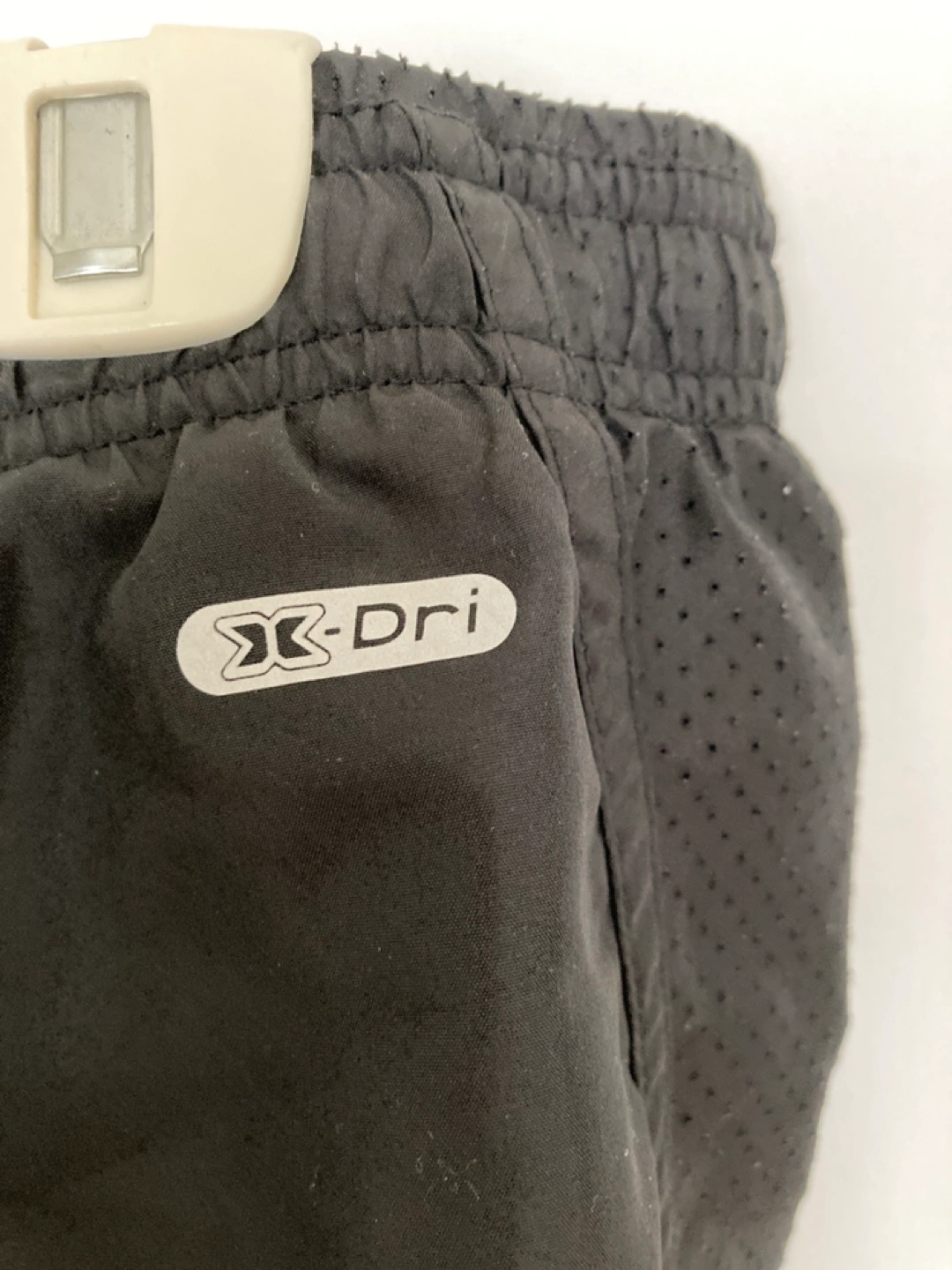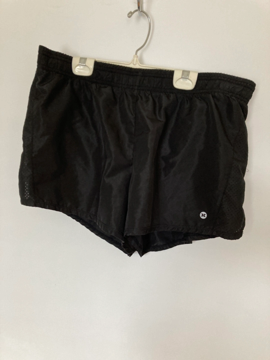 Black running shorts. Size large. 100% polyester. Drawstring waist. Mesh panels for ventilation. Excellent for workouts.