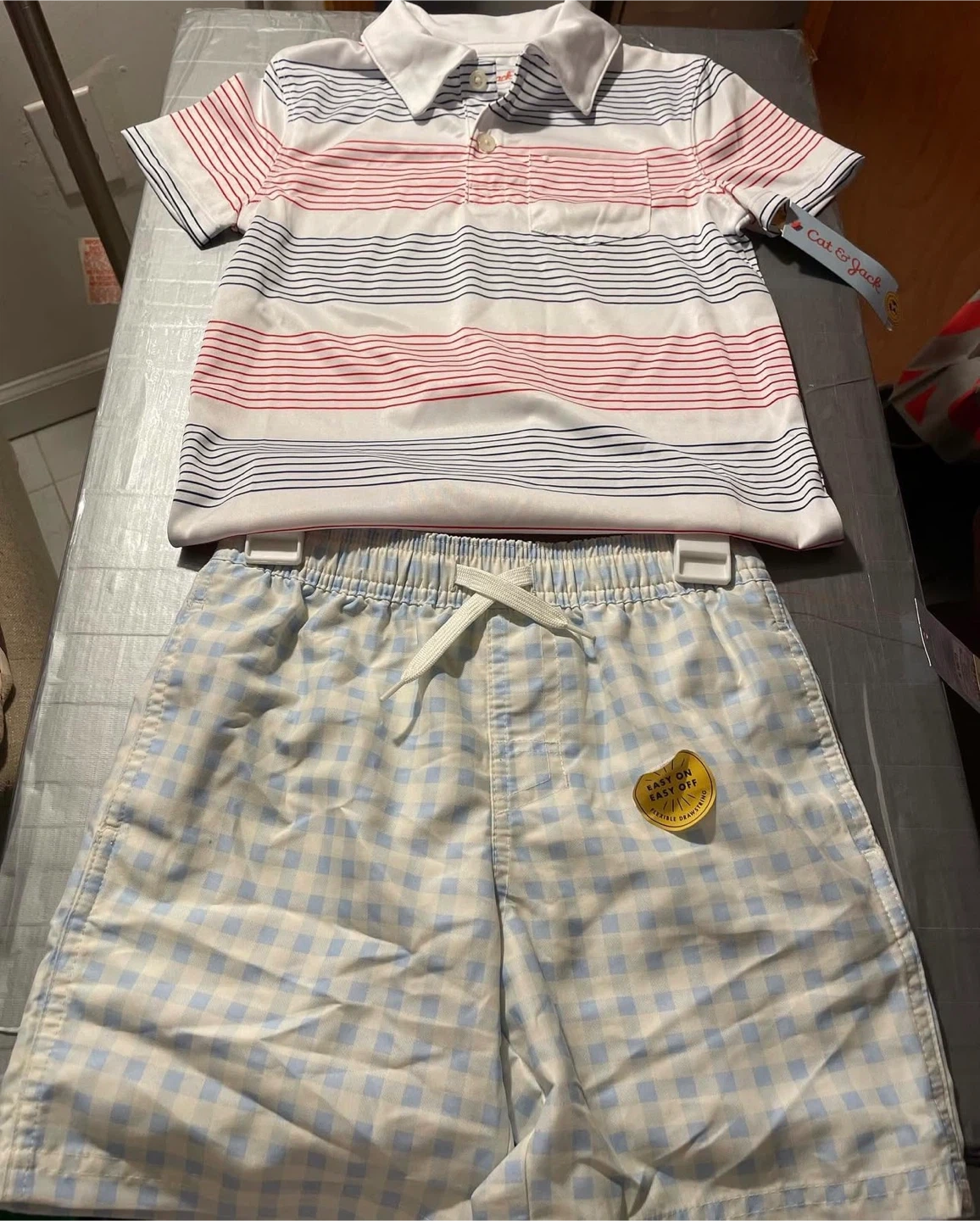 This Cat & Jack set includes a short-sleeve polo shirt with red, white, and blue stripes and a pair of light blue gingham shorts. The shorts have an elastic waistband with a drawstring. It's a comfortable outfit for warm weather!