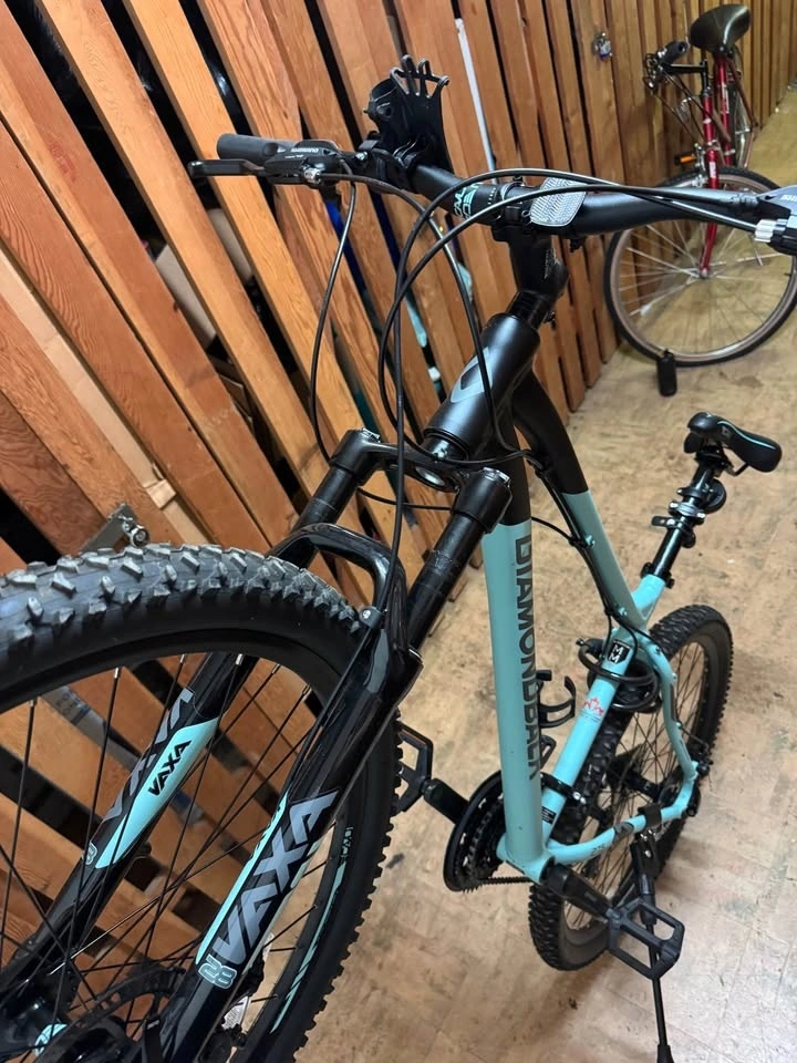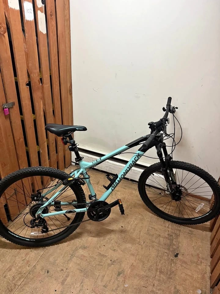 Great condition Diamondback Expresso mountain bike, size Large. Features a lightweight 6061 T6 aluminum frame, Vaxa 100mm front suspension fork with adjustable preload, and 27.5" x 2.25" all-terrain tires. Equipped with Tektro mechanical disc brakes and a Shimano 24-speed drivetrain with Rapid Fire Plus shifters. Includes a CAVU Comfort-Mountain saddle, CAVU lock-on grips, a cellphone holder, night lights, and a bike padlock. Originally retailed for $674.99 + tax.