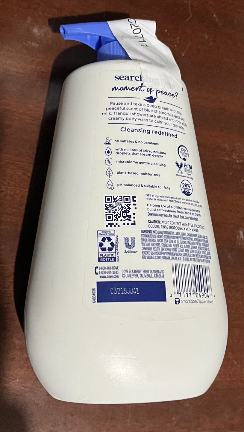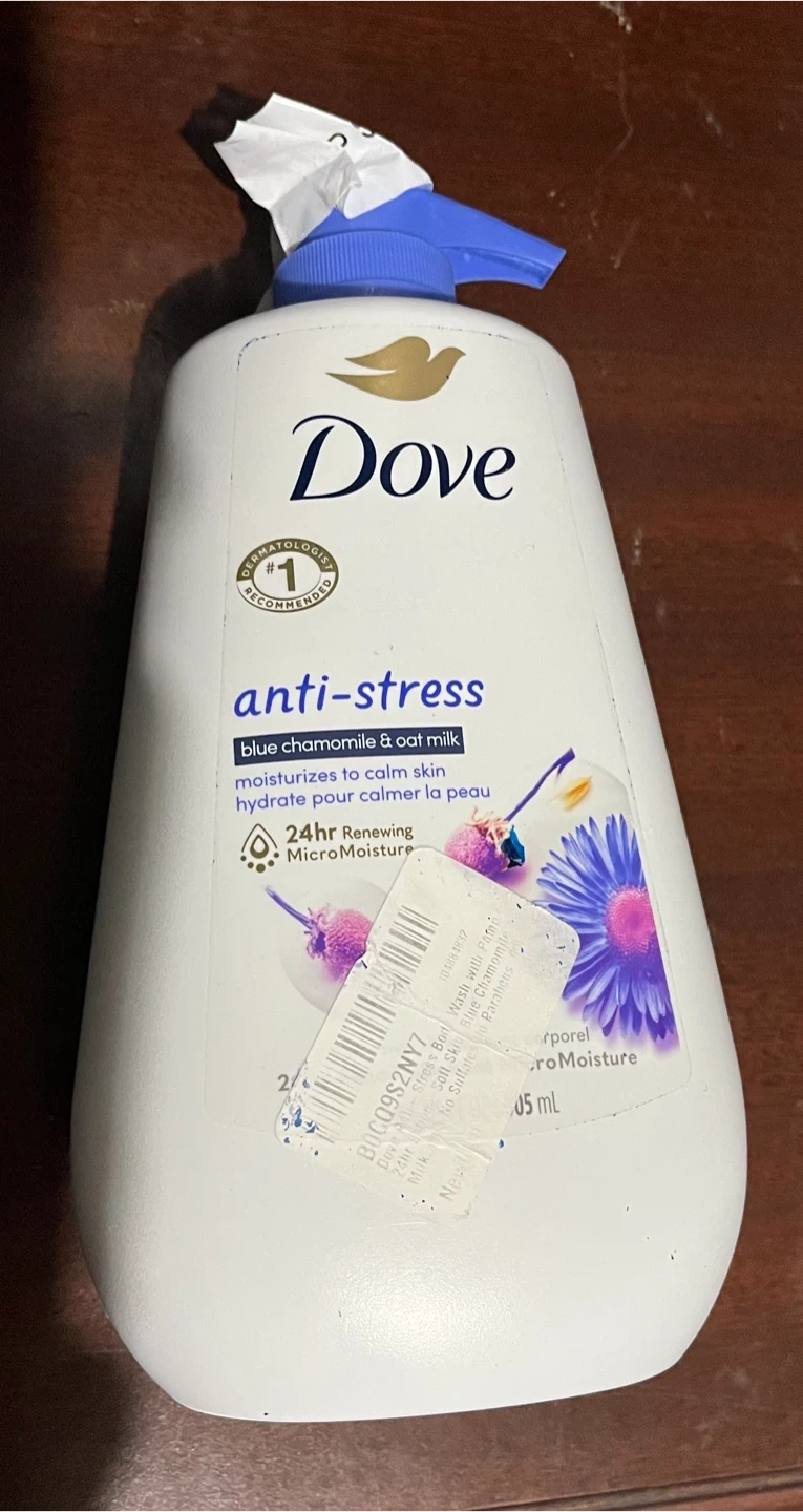 Dove Anti-Stress body wash with blue chamomile and oat milk. It moisturizes to calm skin and provide 24hr renewing MicroMoisture. It's sulfate and paraben free with microbiome gentle cleansing.