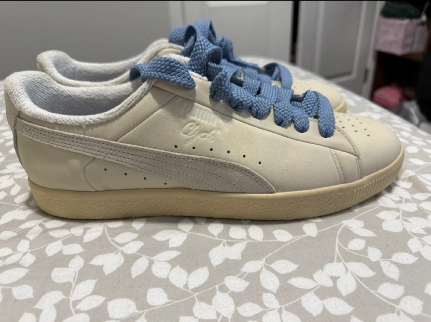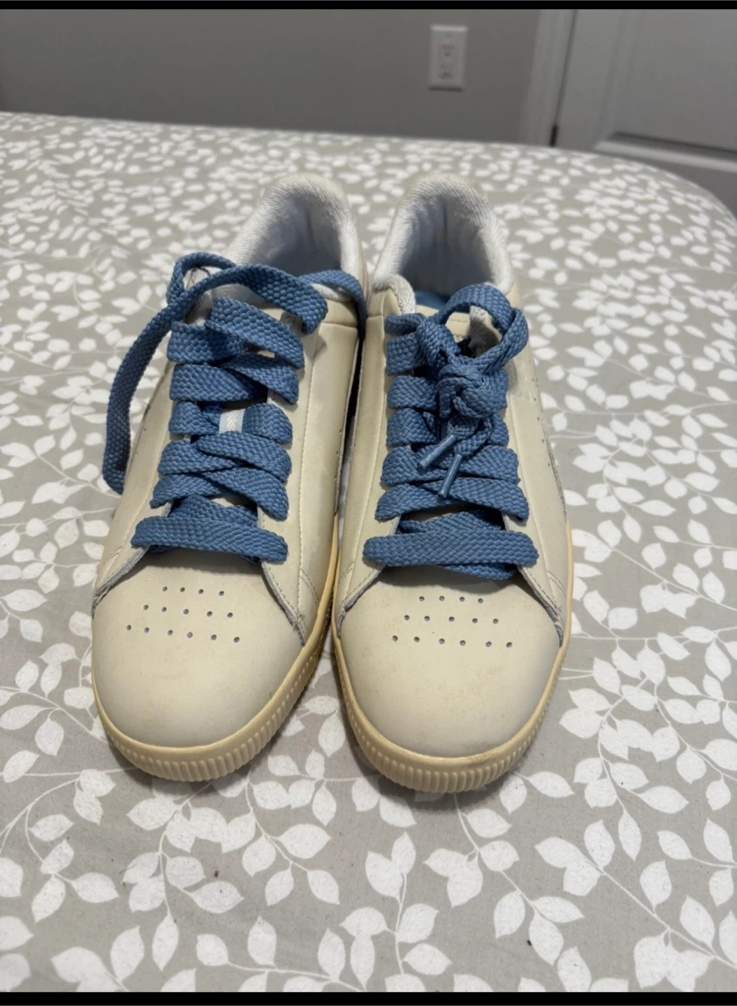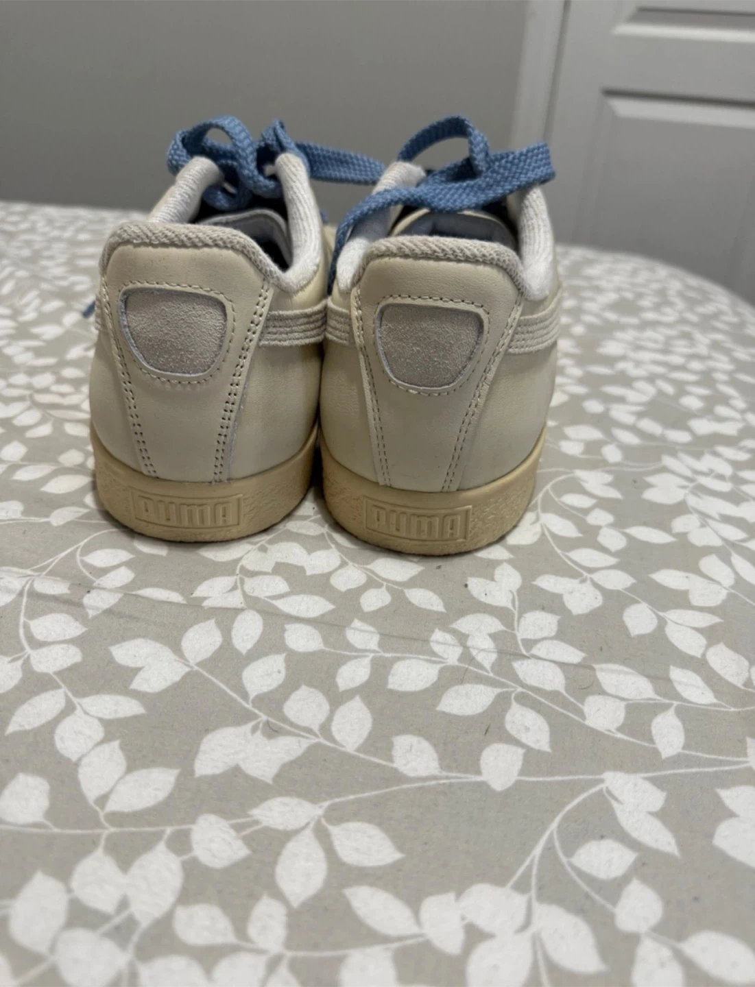 Just worn 2 3 times Cream-coloured Puma Clyde Nostalgia sneakers with light blue laces. Suede and leather upper.