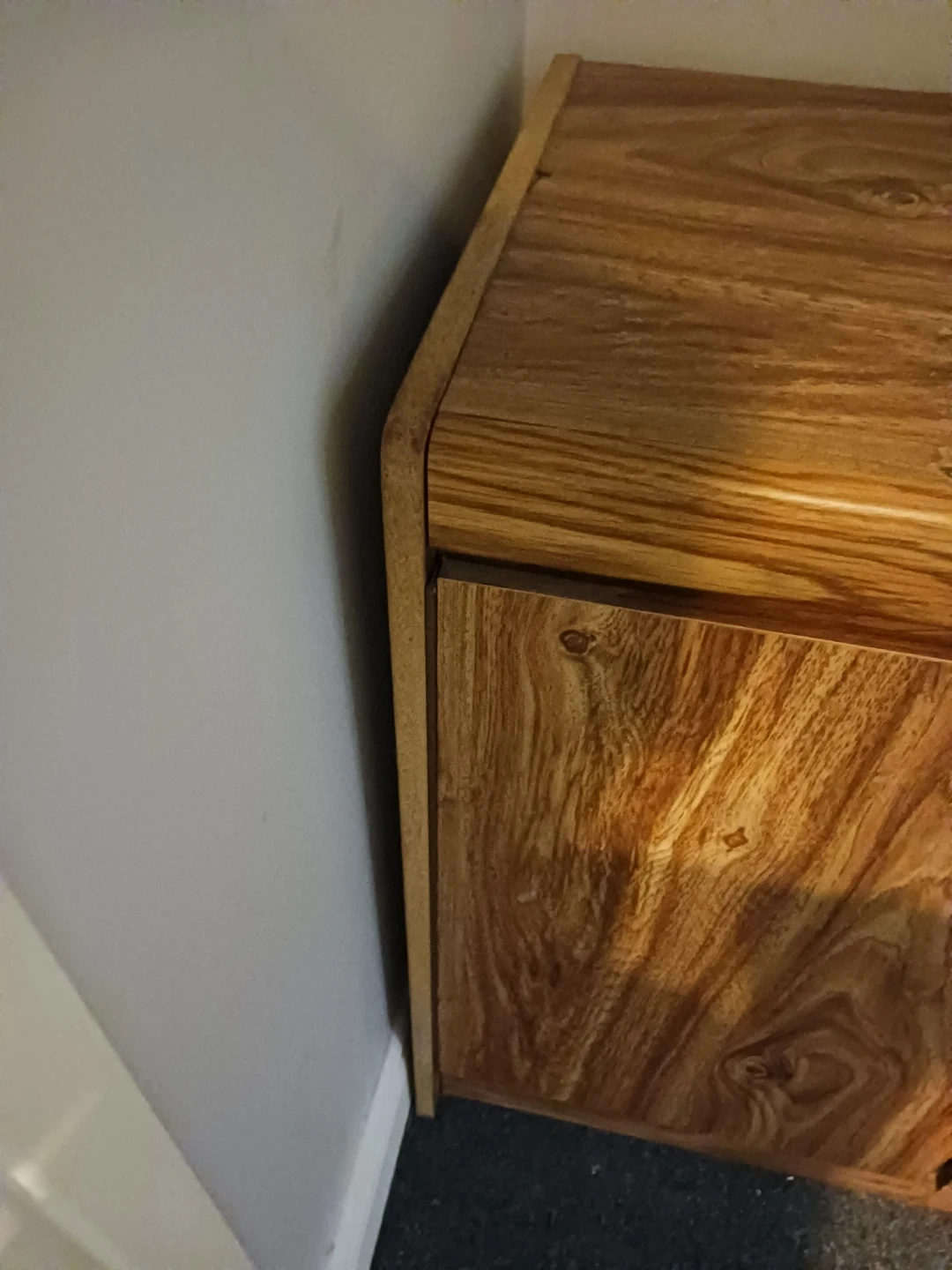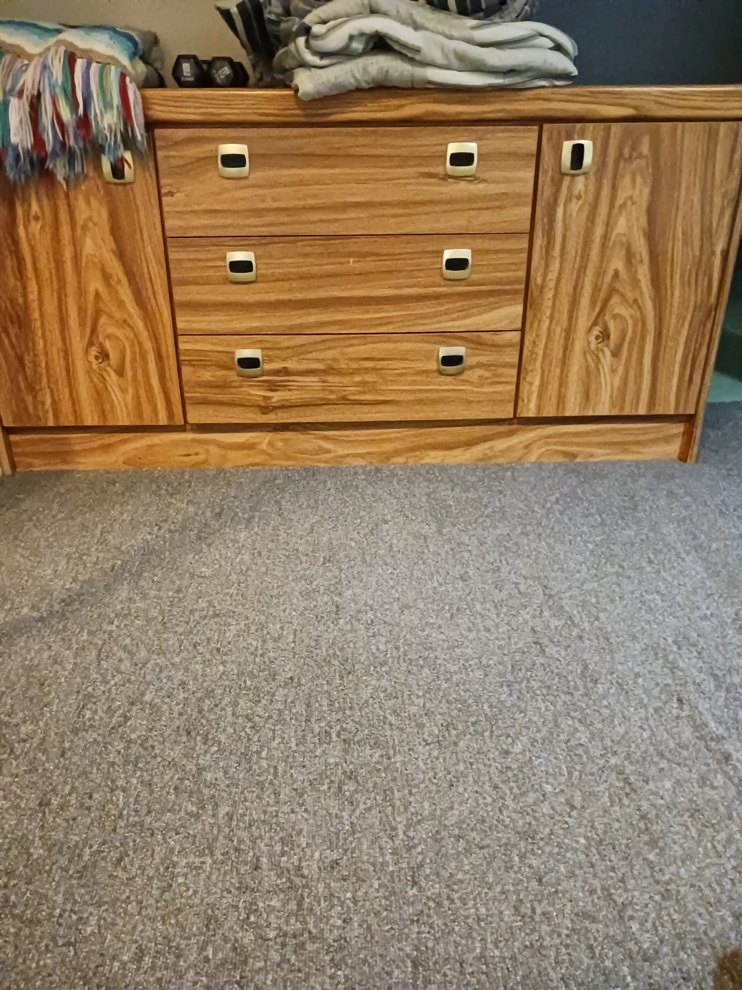 This wooden dresser offers ample storage with three drawers and two cabinet doors. The wood grain finish gives it a warm, inviting look. It's suitable for a bedroom or living area for organizing clothes or linens.