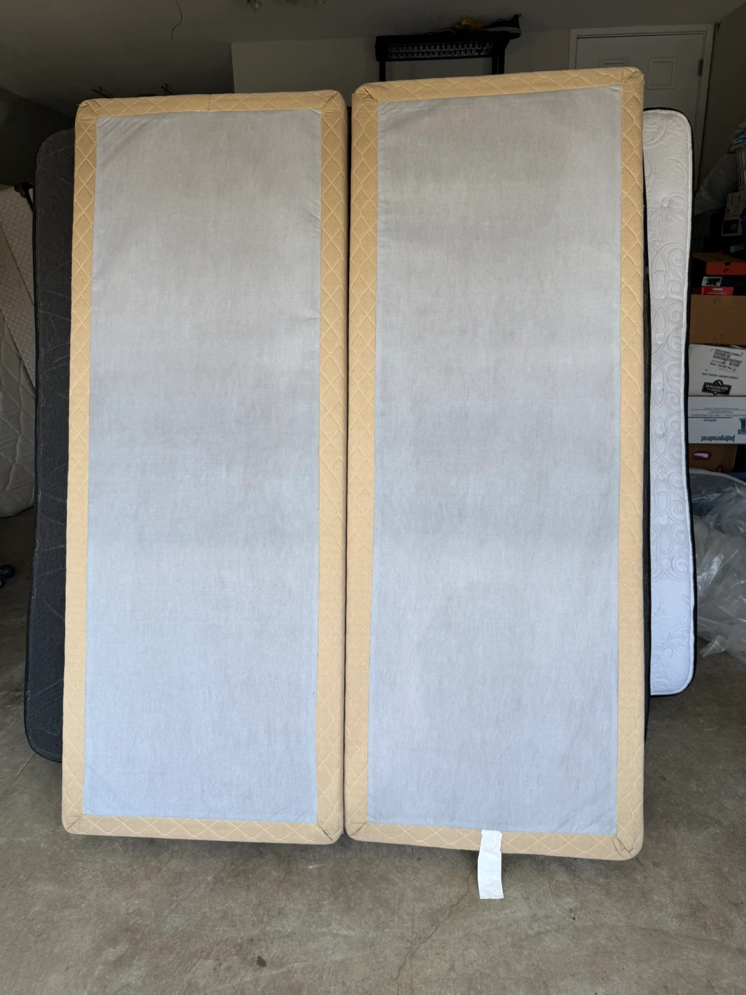 Split queen box springs are available. They are beige and quilted. These provide a firm foundation for your mattresses. Pick up or delivery available for extra cost