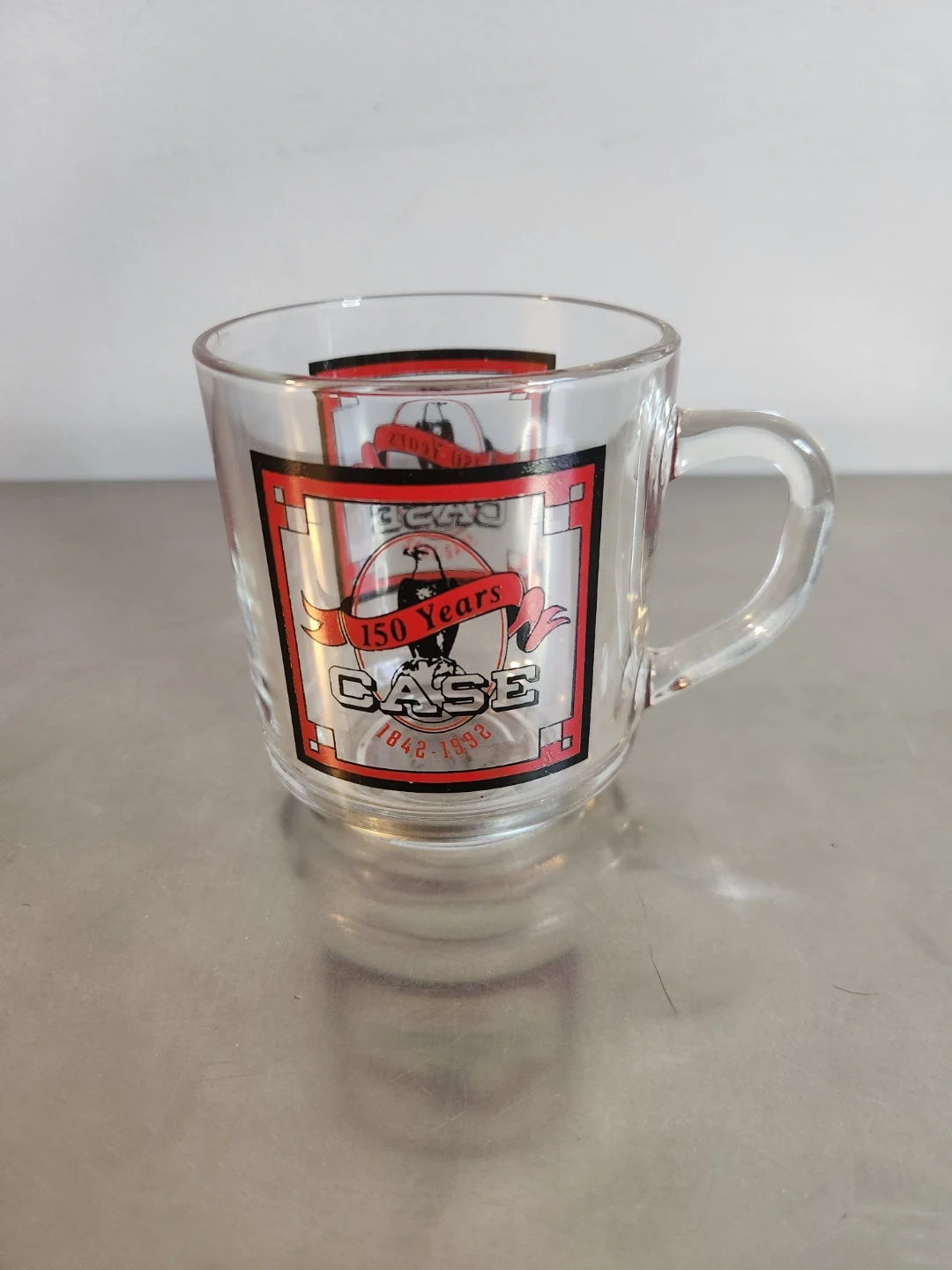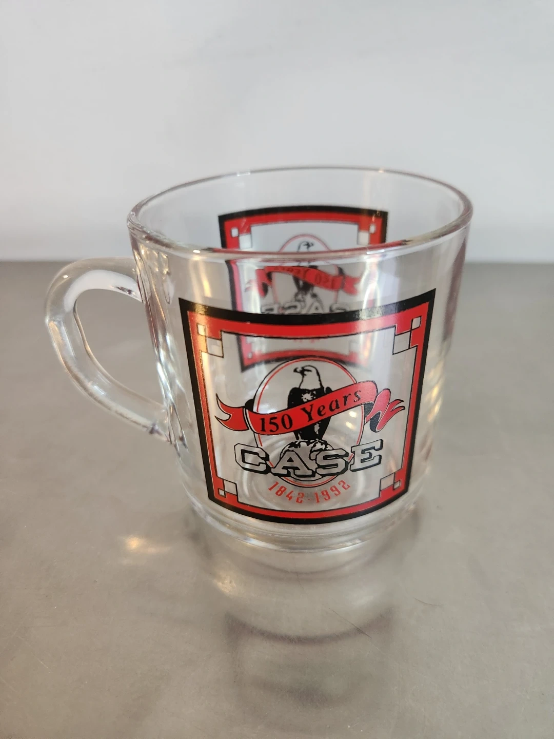 This clear glass mug celebrates CASE's 150 Years of operation, from 1842 to 1992. It's dishwasher and microwave safe. It features the CASE logo with an eagle emblem and commemorative text.