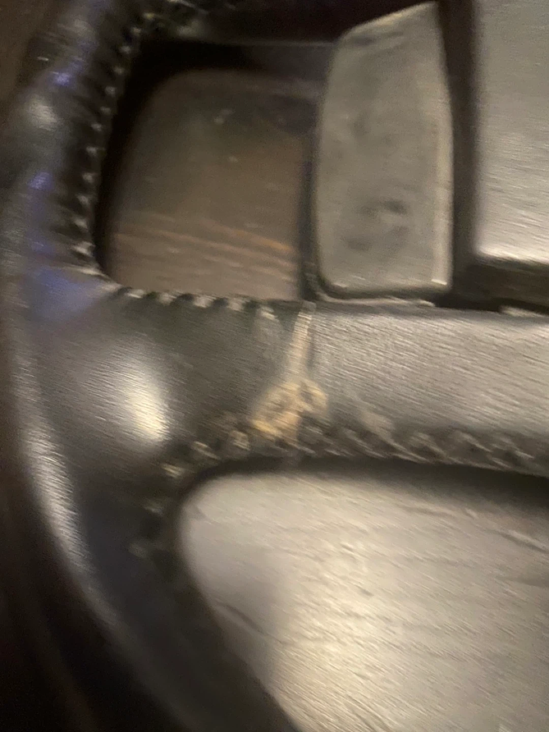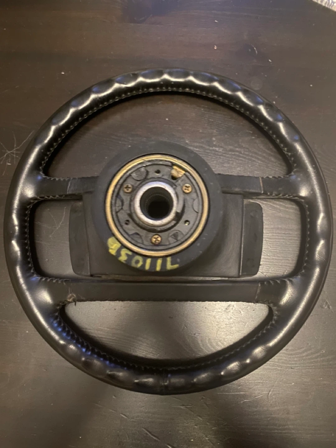 Leather-wrapped steering wheel for a Porsche. This wheel has been used and shows some wear marks on the leather. It's black with stitched detailing.