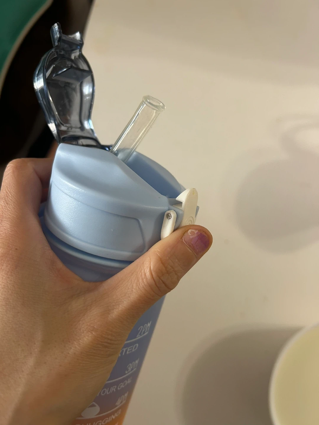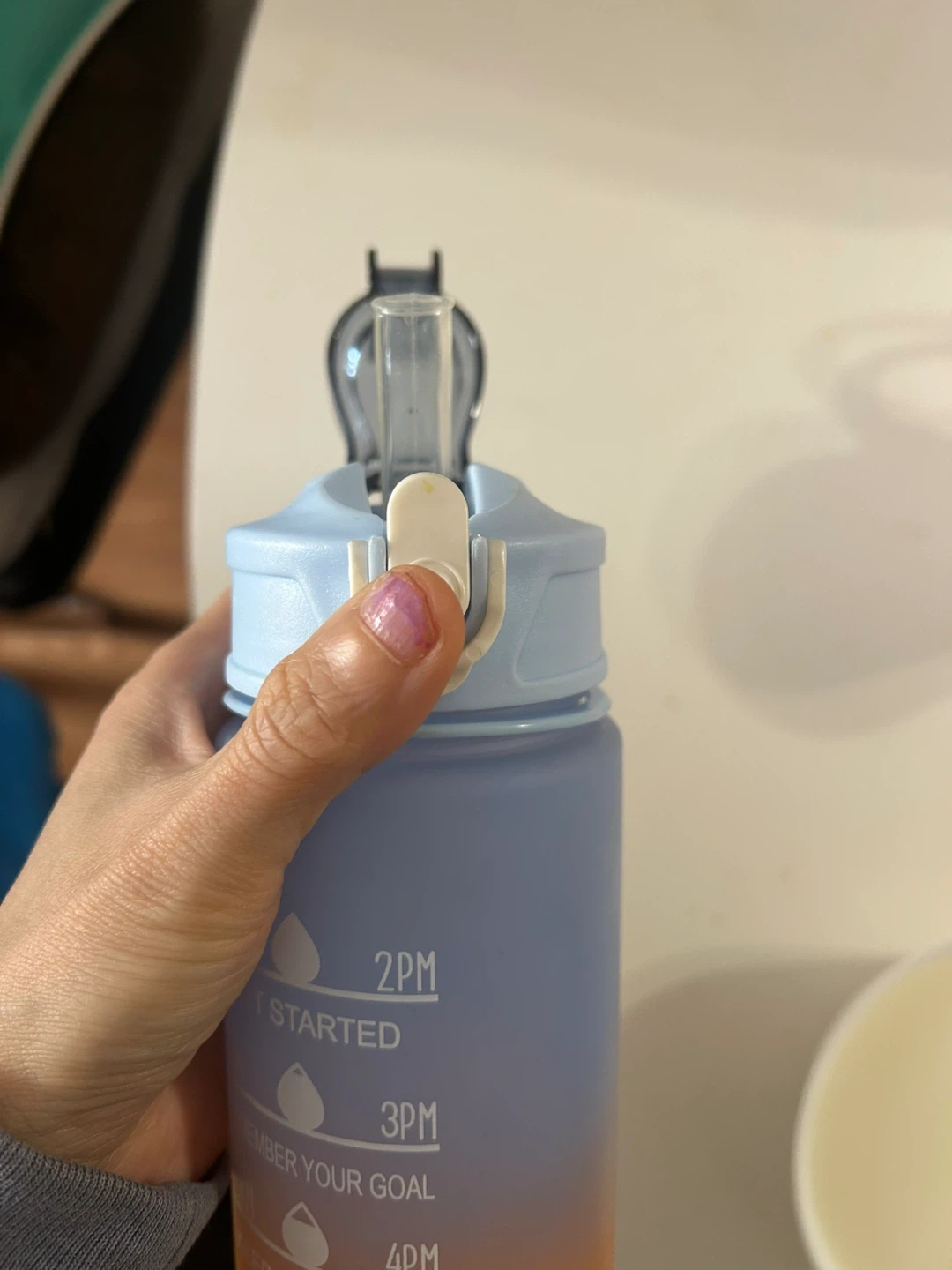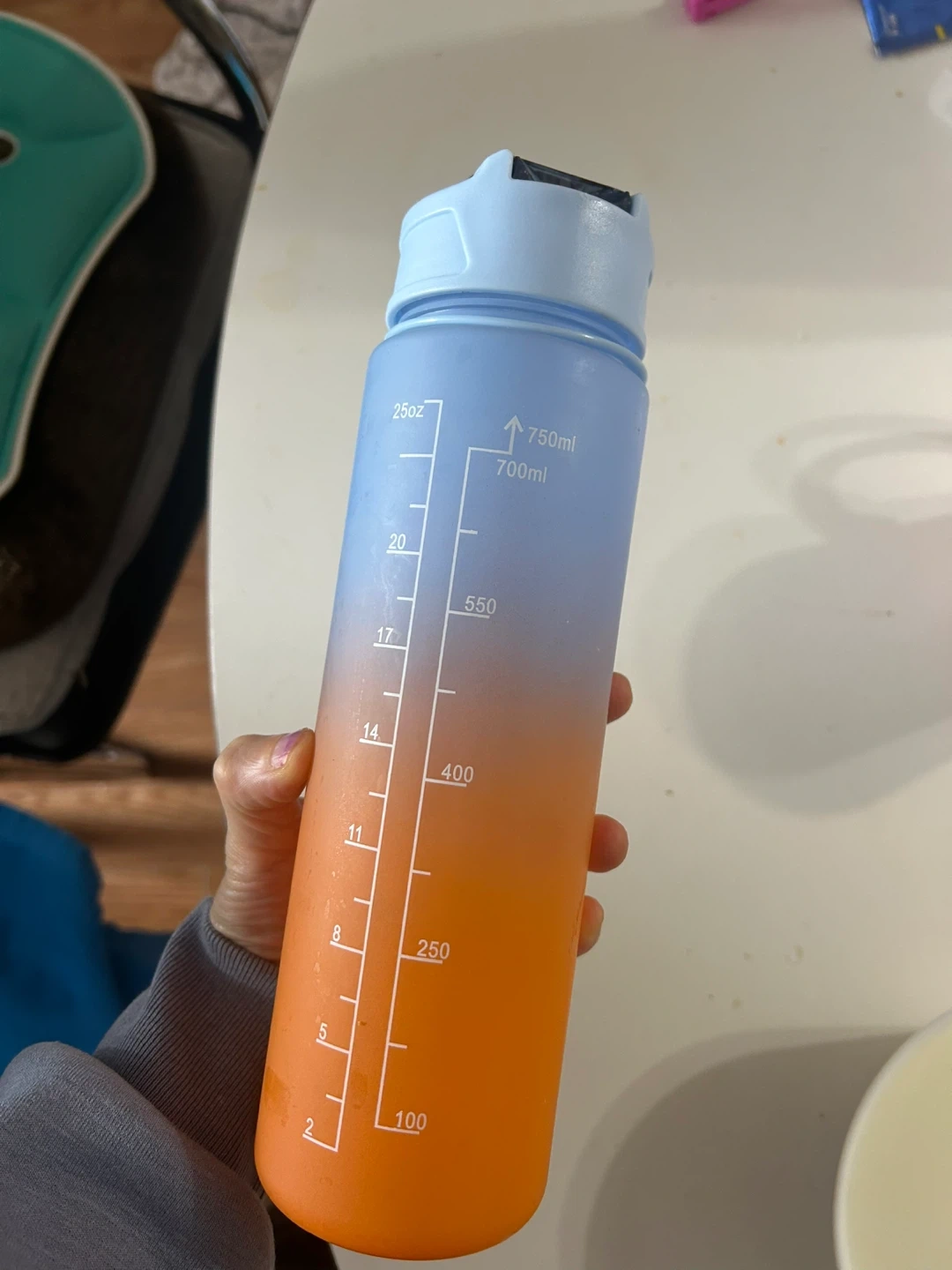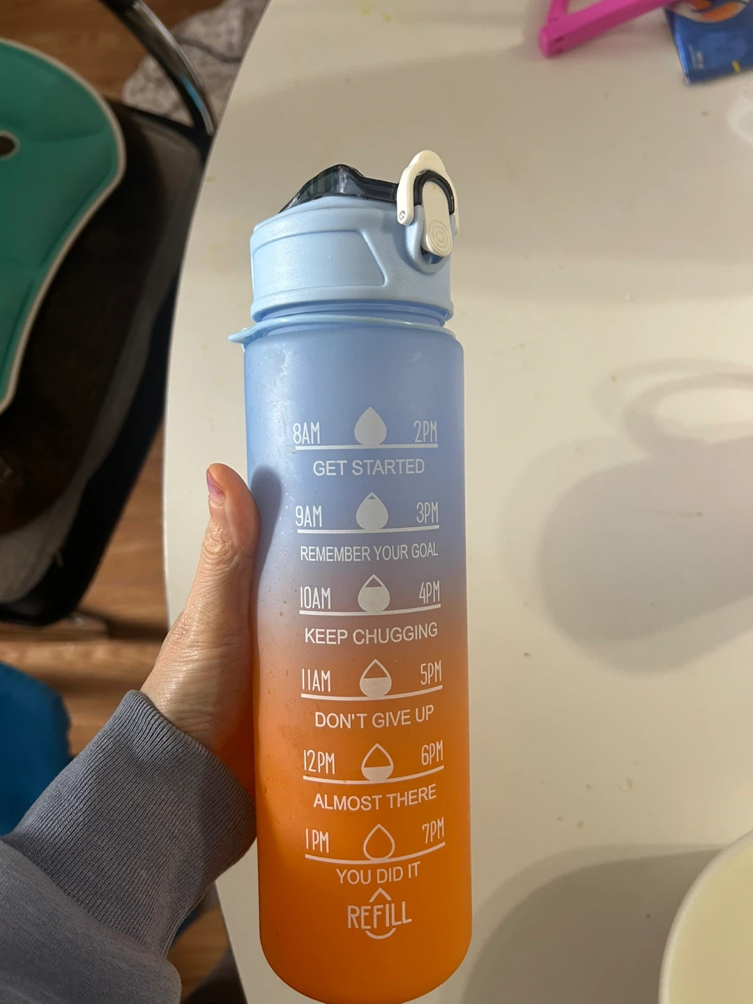 This 750ml water bottle has time markings to help you stay hydrated throughout the day. It features a convenient straw and a leak-proof lid. Great for tracking your water intake at home or on the go!
