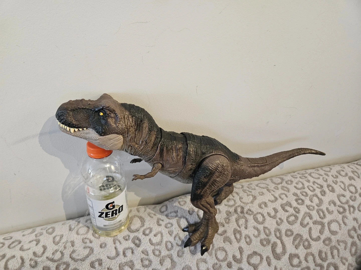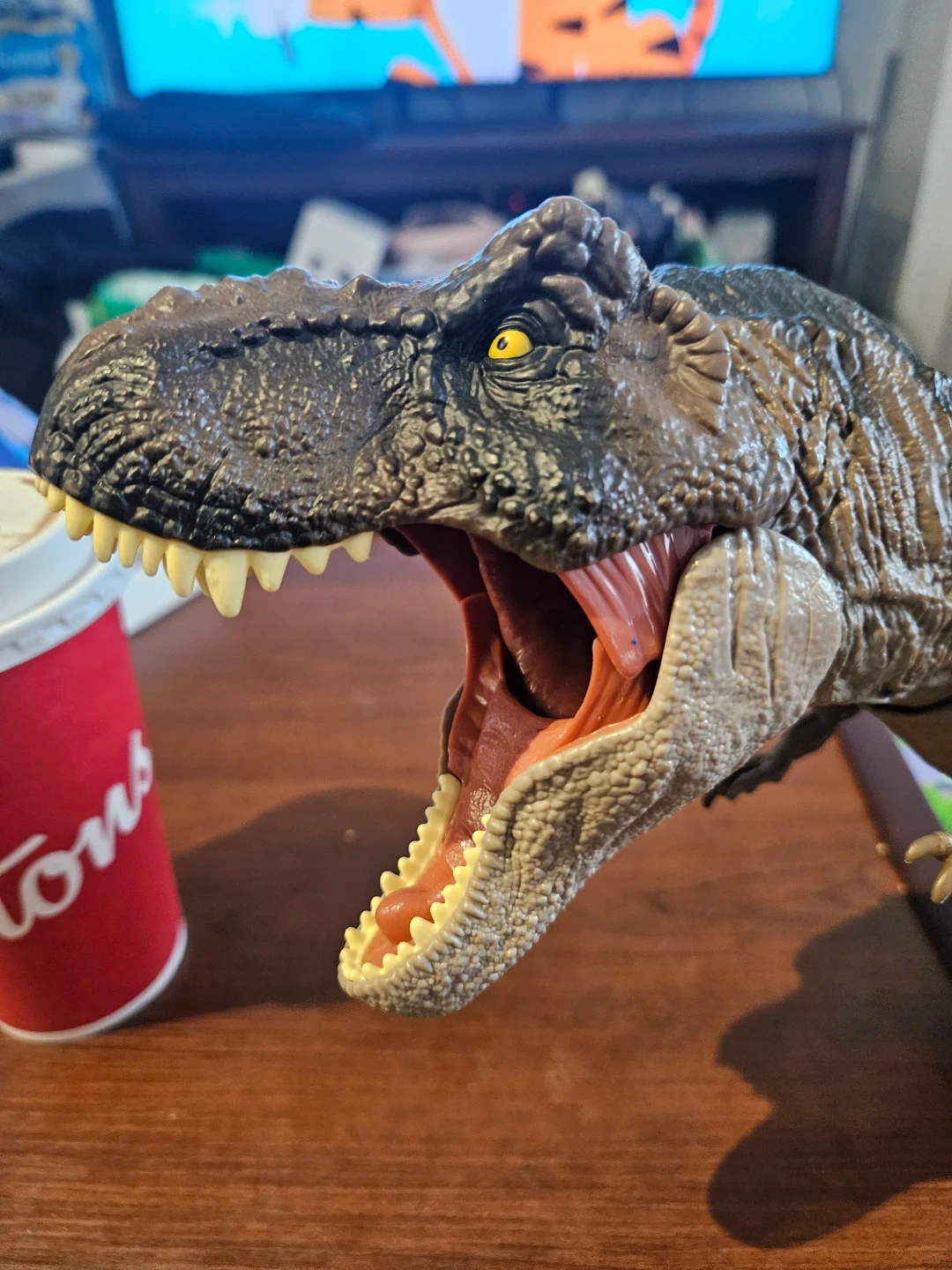 This is a Jurassic World T-Rex dinosaur toy. It's detailed with realistic coloring and textures. It's a great toy for dinosaur enthusiasts of all ages!