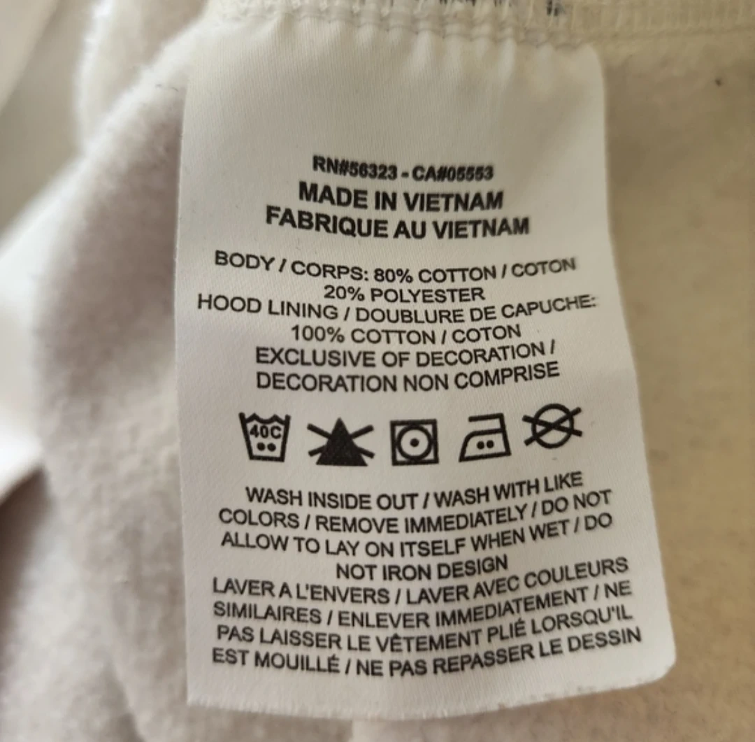 This Nike hoodie is made with a body of 80% cotton and 20% polyester. The hood lining is 100% cotton. It's a standard fit and is a size XL. Easy to wash inside out with like colours!