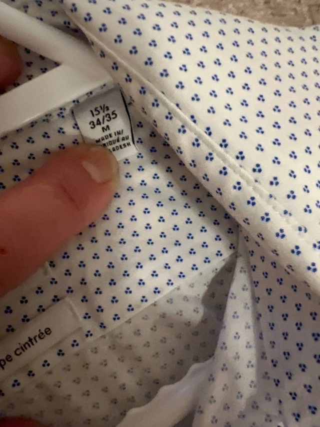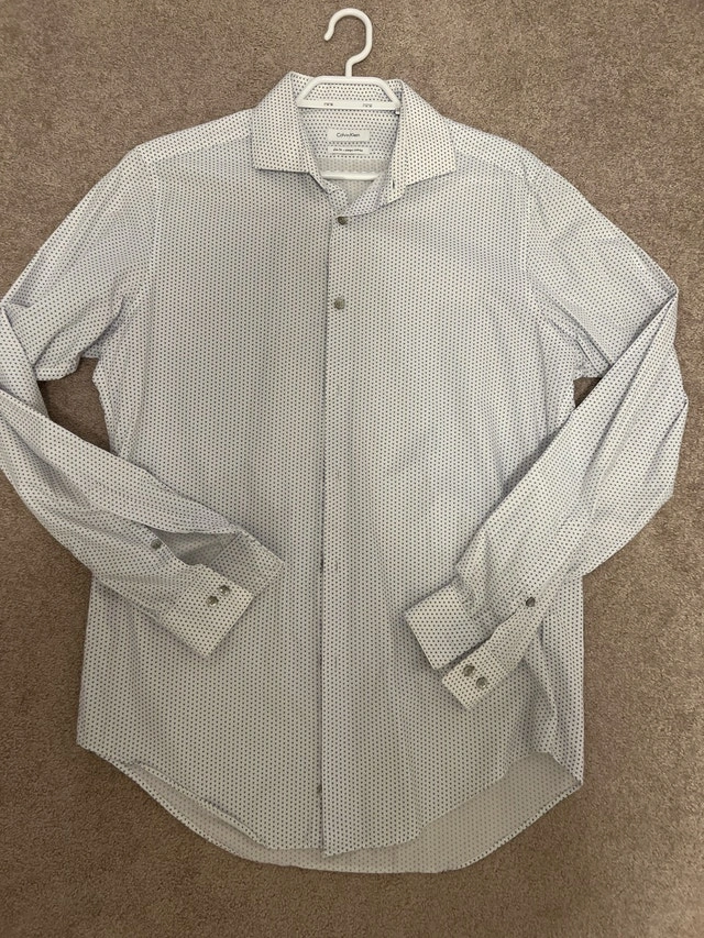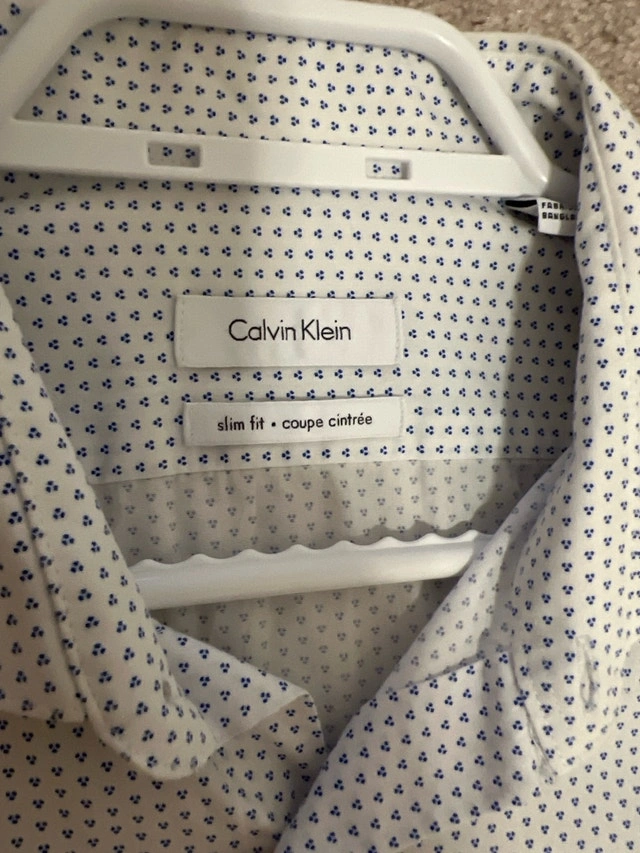 Upgrade your wardrobe with this stylish Calvin Klein shirt, featuring a sleek slim fit and a modern design with subtle blue dots. This is a used shirt in good condition, perfect for adding a touch of sophistication to any outfit. Specifications: Brand: Calvin Klein, Fit: Slim Fit, Size: Medium (15 1/2, 34/35). Let me know if you're interested!