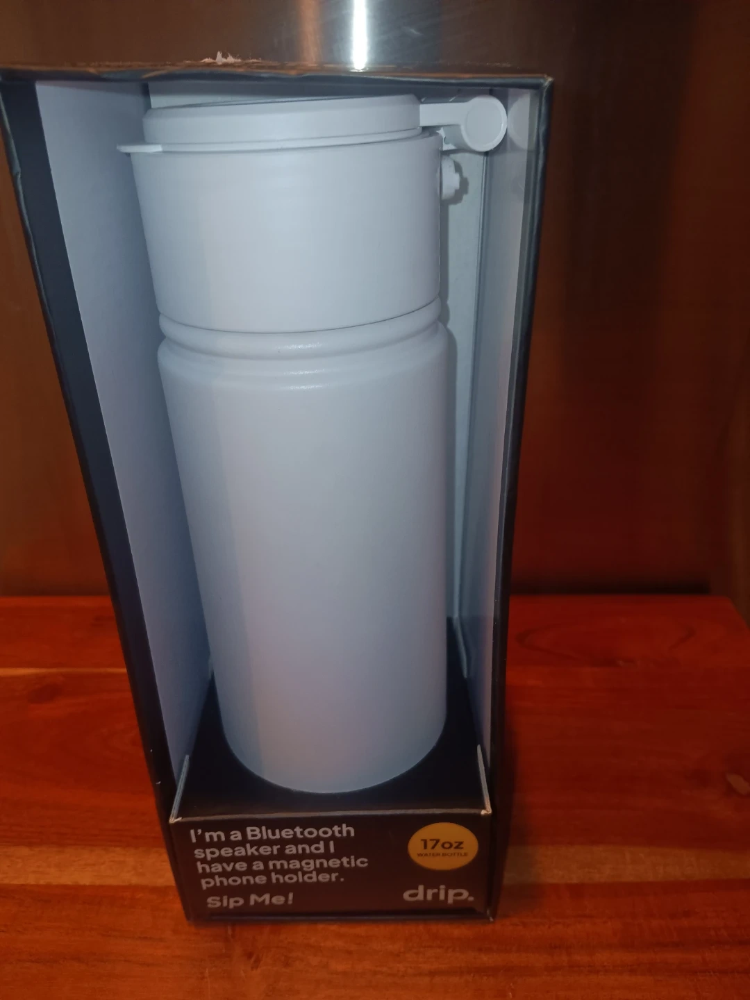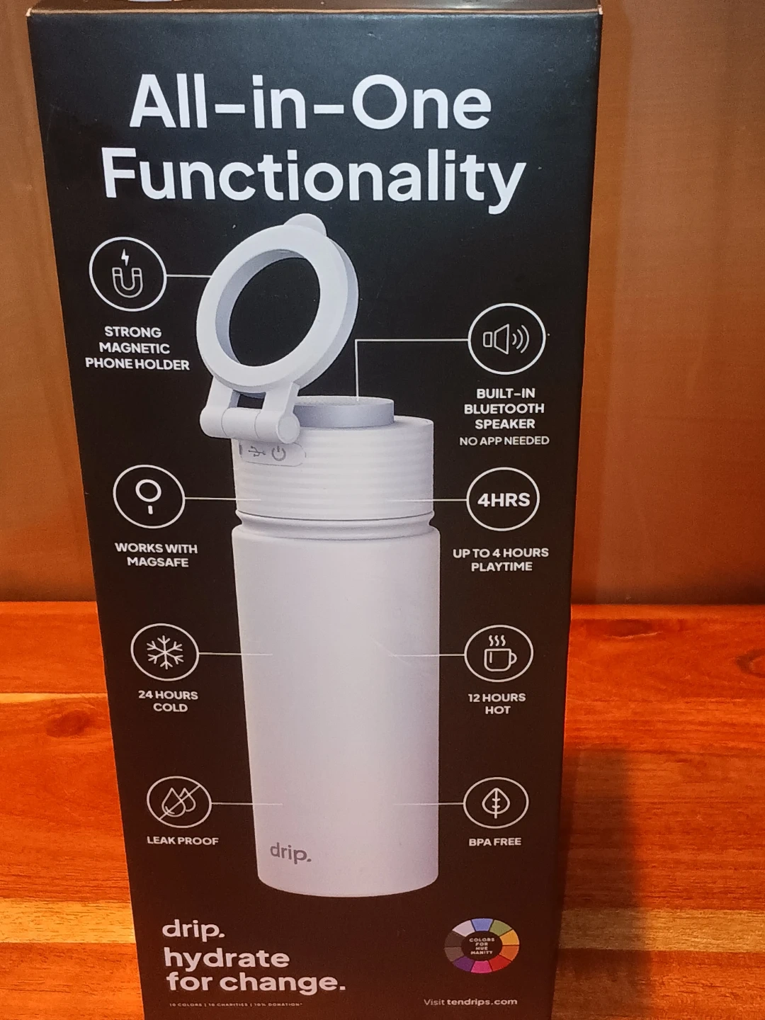 This white Drip. water bottle features a built-in Bluetooth speaker and magnetic phone holder. It keeps drinks cold for 24 hours or hot for 12 hours and is leakproof. The bottle is BPA free and has up to 4 hours of playtime. It's compatible with MagSafe.