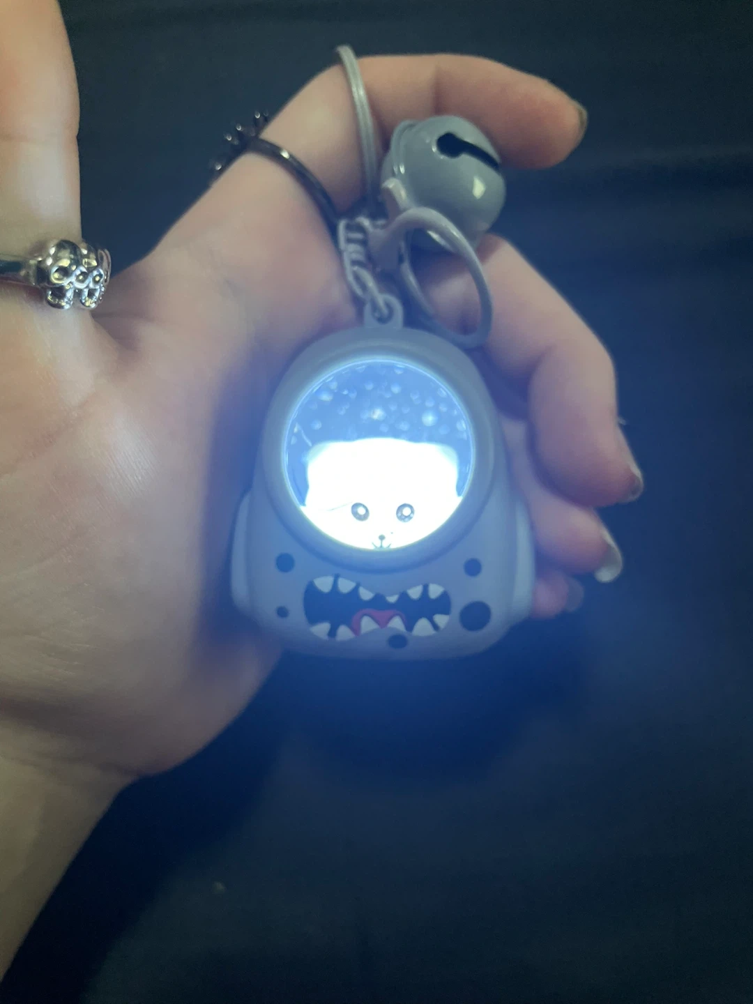 This is a fun keychain featuring a cute astronaut cat with a light-up feature! It has a playful monster mouth design and a little bell accessory. It's a great little gadget to add some personality to your keys or backpack.