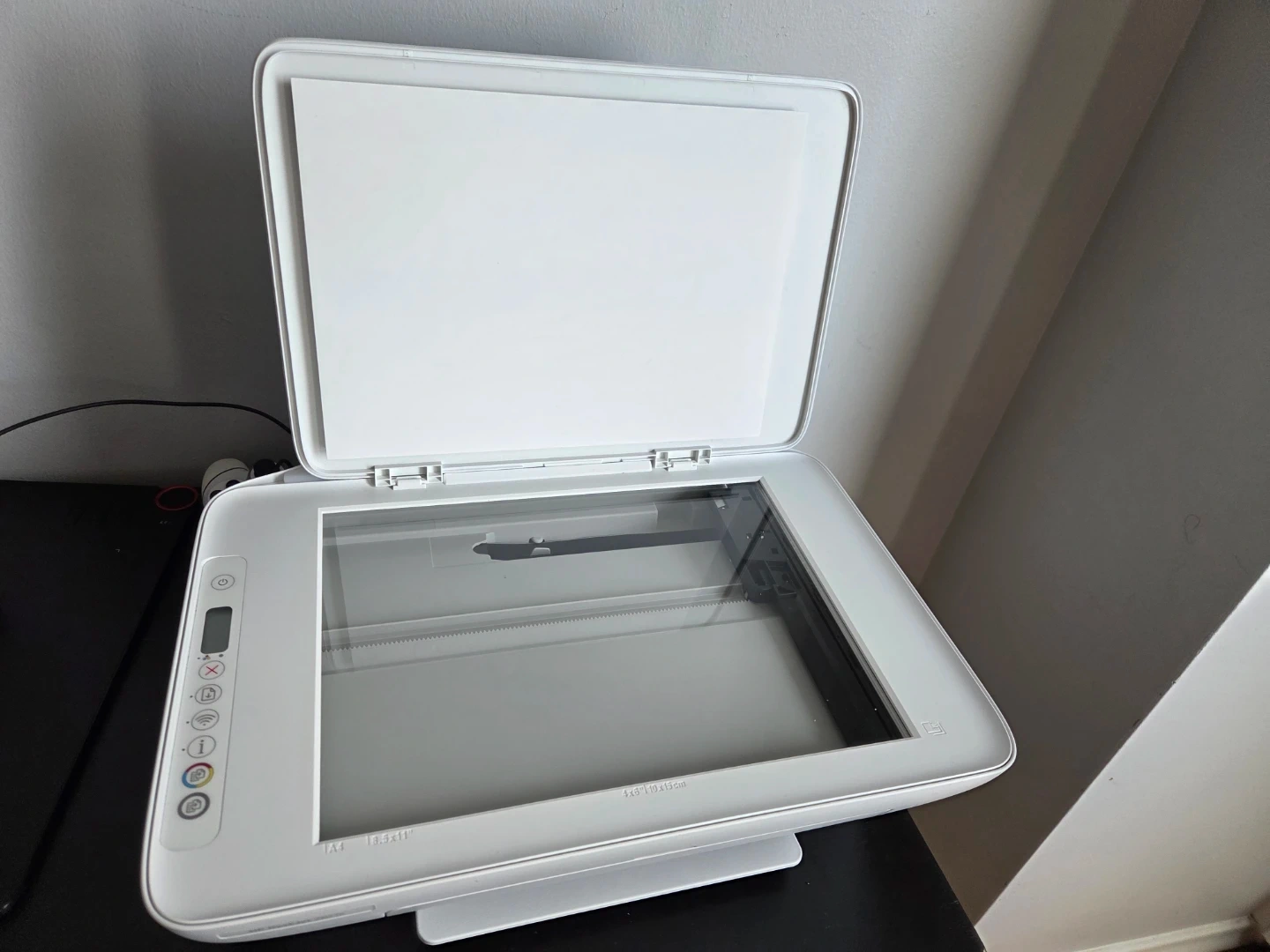 This is a white HP DeskJet 2627e printer. It's an all-in-one unit that can print, scan, and copy. Includes two ink cartridges. It's a compact device, great for home use!