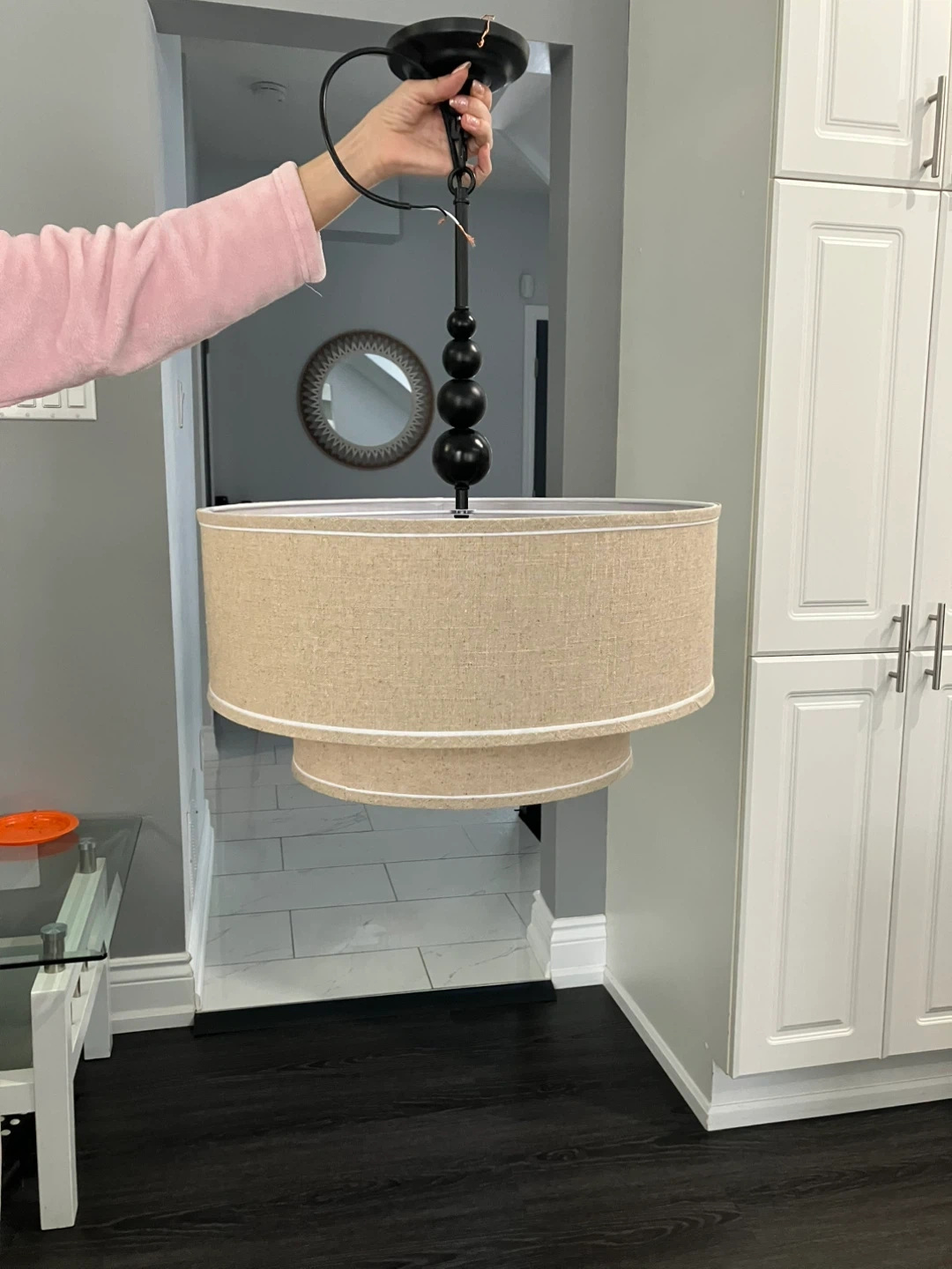 Tiered drum pendant light fixture with a fabric shade. It has a black beaded stem and a black mounting base. This light fixture is suitable for dining rooms or entryways.