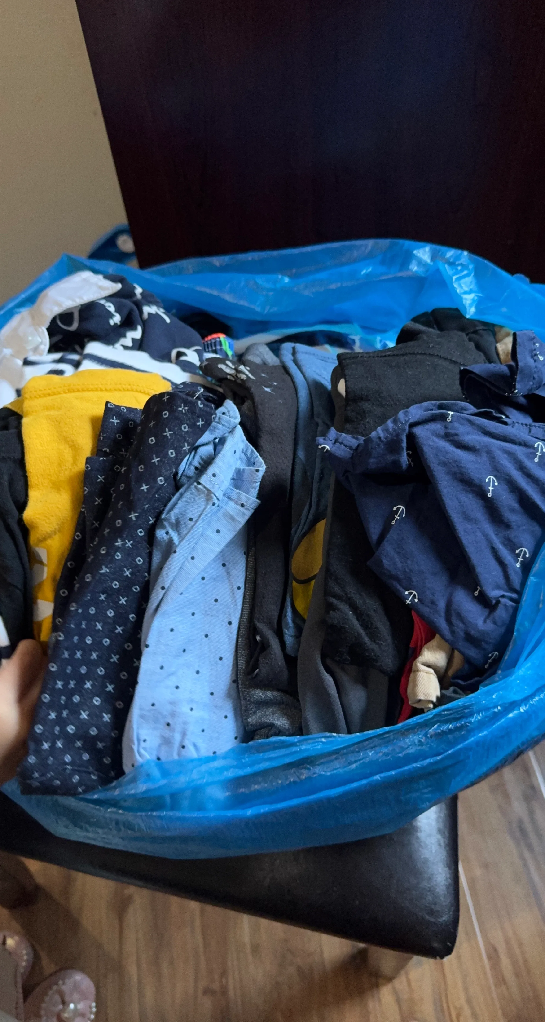 This is a bundle of boys' clothing items. Includes shirts and pants with various patterns and colors. Some items feature anchor and geometric prints. Cotton and blends are likely materials.