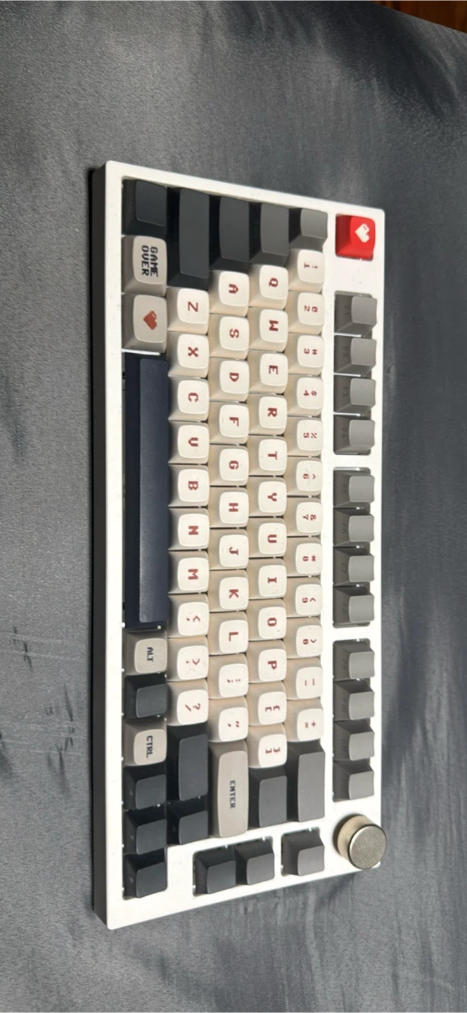 A 75% layout custom mechanical keyboard with a white case. It features a unique keycap set with beige, grey, and black accents, including special 'Game Over' and heart keycaps. Includes a knob for volume control.