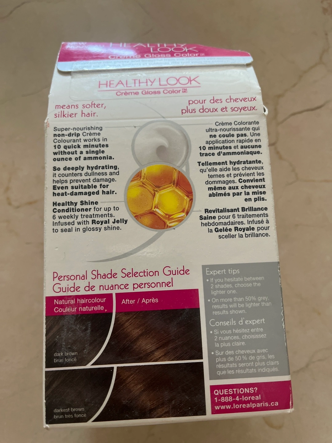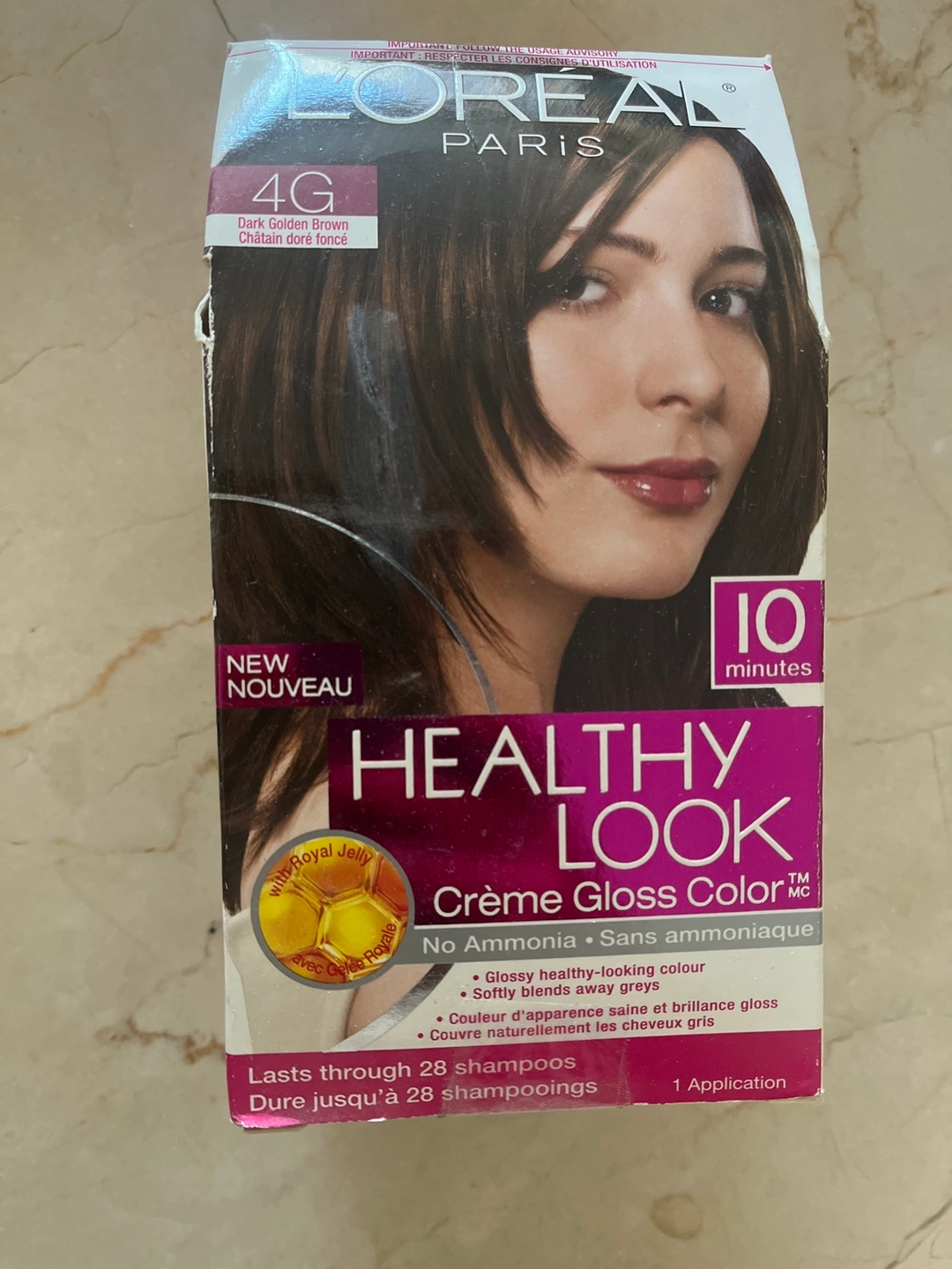 One box of L'Oréal Paris Healthy Look Creme Gloss Color 4G Dark Golden Brown. This is a no ammonia, 10 minute hair colour that lasts up to 28 shampoos.