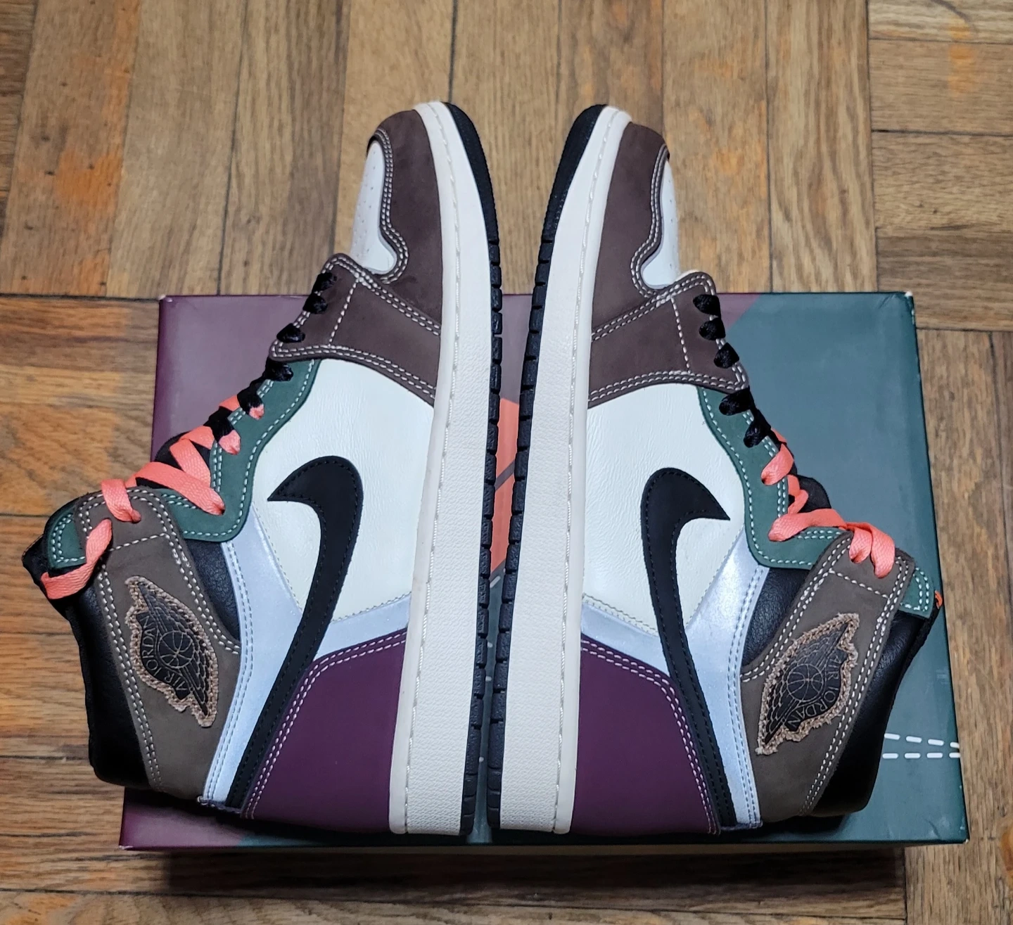These are the Air Jordan 1 High OG Palomino sneakers. They feature a mix of leather and suede in brown, white, black, and teal colorways. Comes with original box. A classic silhouette for any sneaker collection!