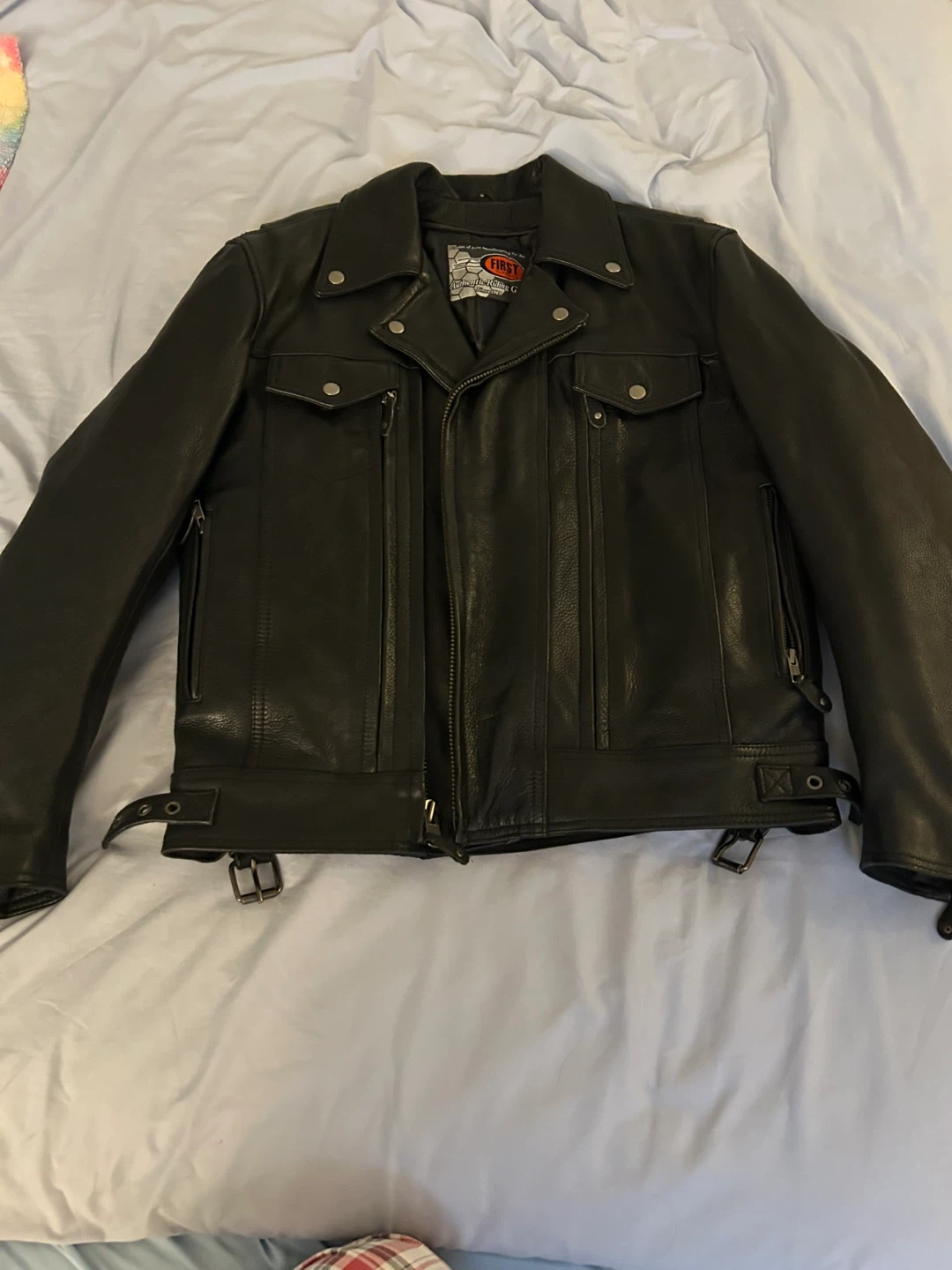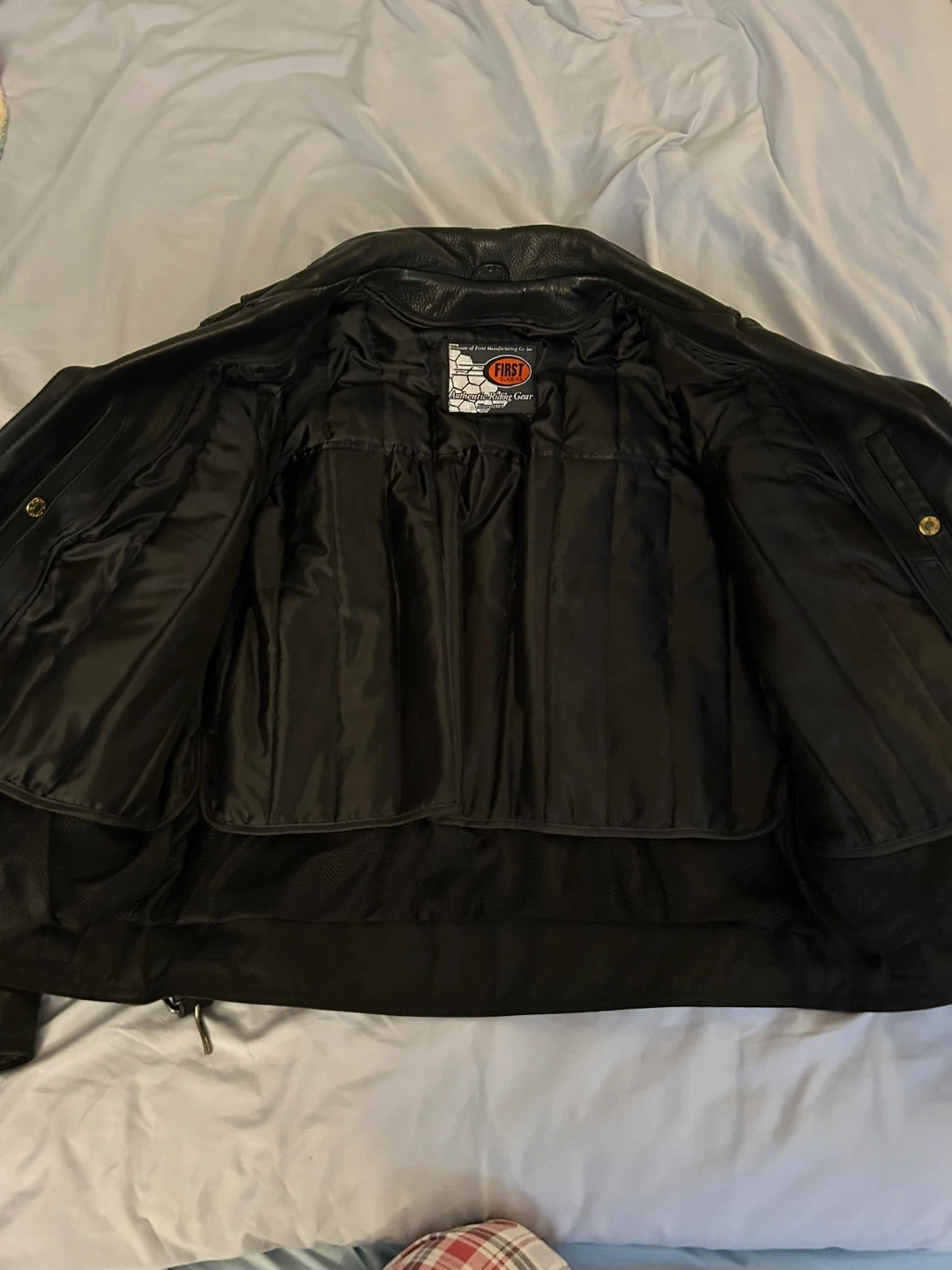 This is a black leather motorcycle jacket from First Manufacturing Co. It's made of genuine leather. This jacket includes a quilted lining for added warmth. It's designed for motorcycle riding.