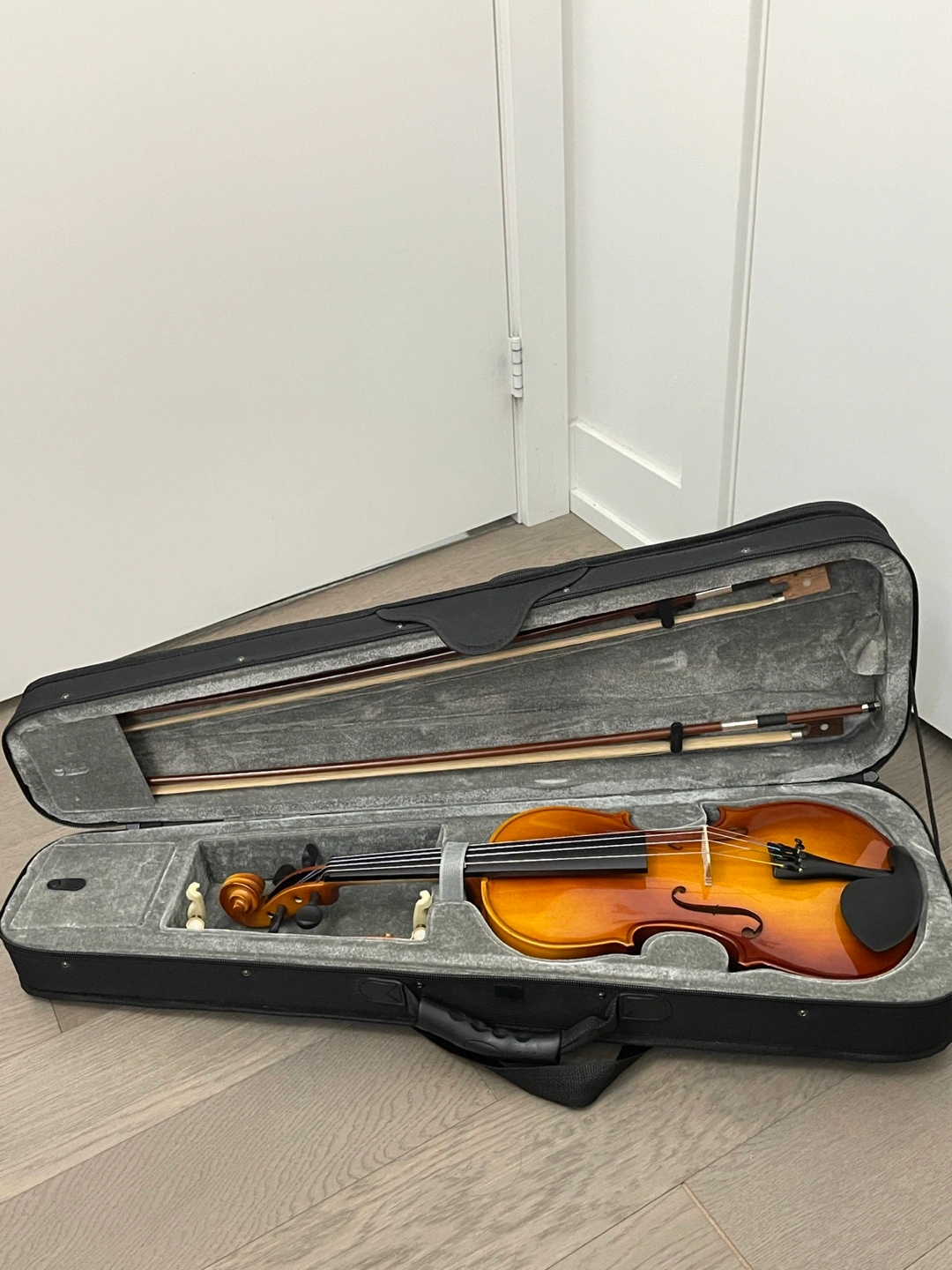 78Used it only 3 times for trial at beginners orchestra. It’s in great condition almost good as new Swapped strings to Dominant. Strings were as expensive as the violin itself but giving it away for free Recommend it for beginners or people who are looking to get started. *4/4 full size violin ———— Comes with : - violin with shoulder rest - case with strap - extra string that came with kit - 2 bows and rosin - New micro fibre cloth for cleaning ————- *pickup downtown Toronto. DM for details. Unfortunately no returns and exchange due to second hand nature.