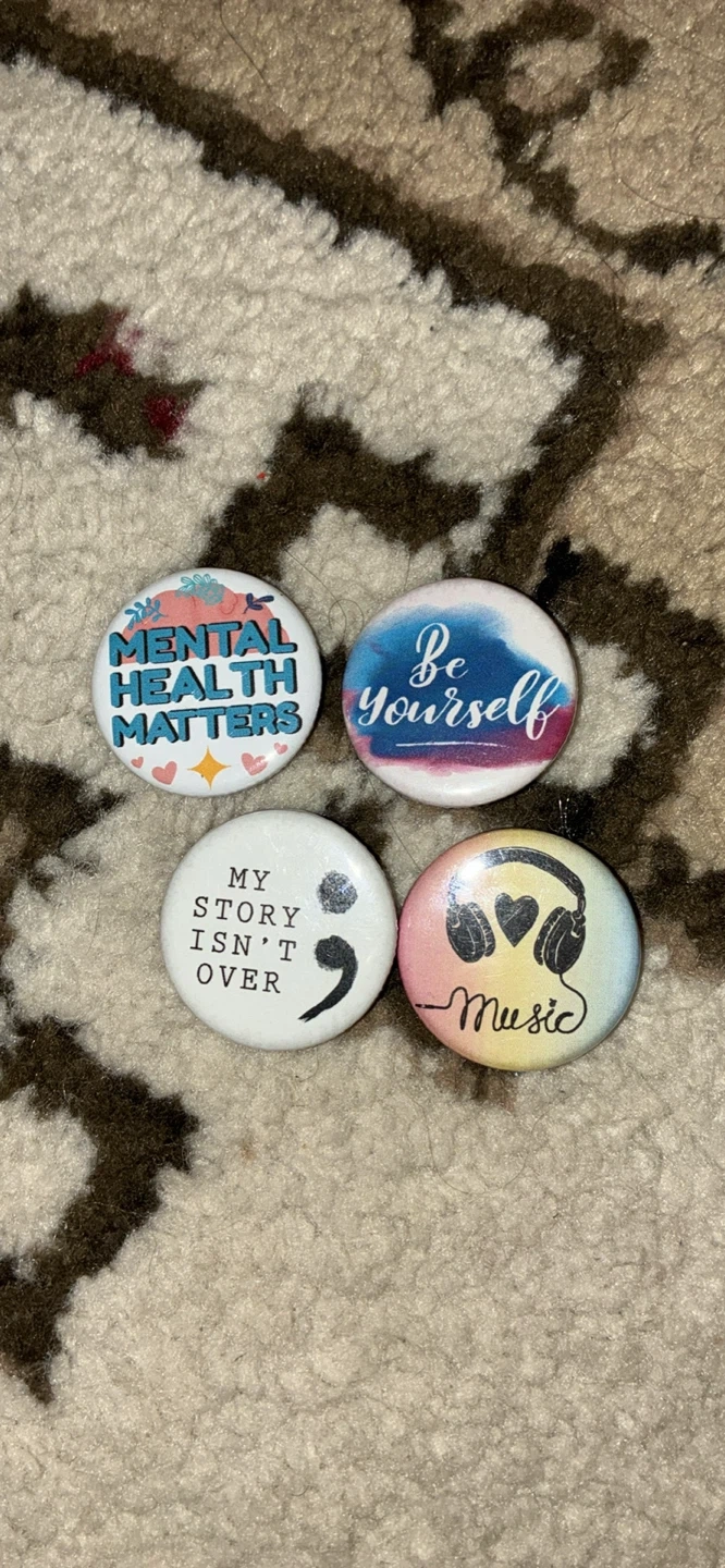 Selling a set of 4 pinback buttons. They feature different designs: 'Mental Health Matters', 'Be Yourself', 'My Story Isn't Over', and a music-themed one with headphones. Great for adding some flair to your bag or jacket!