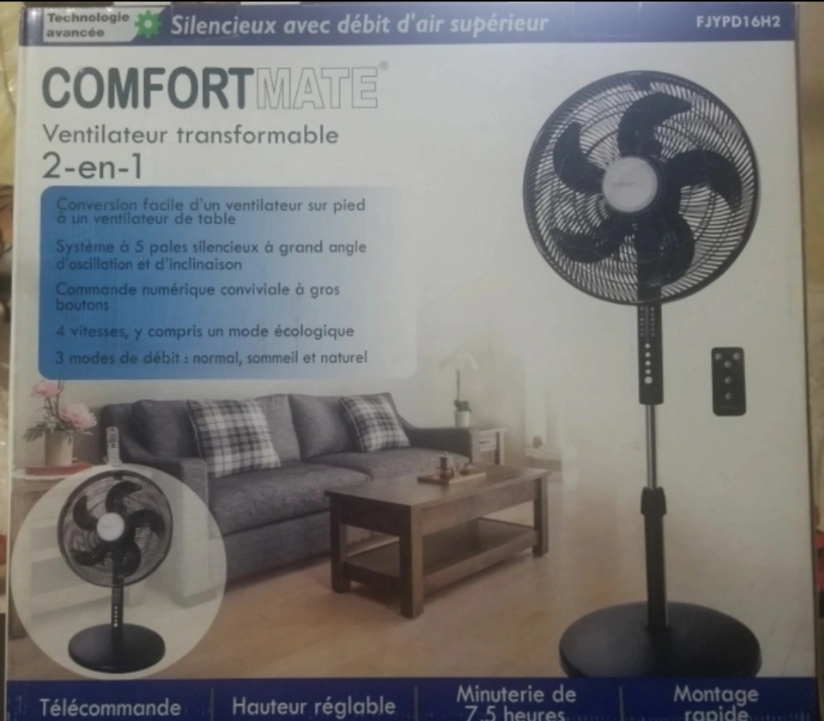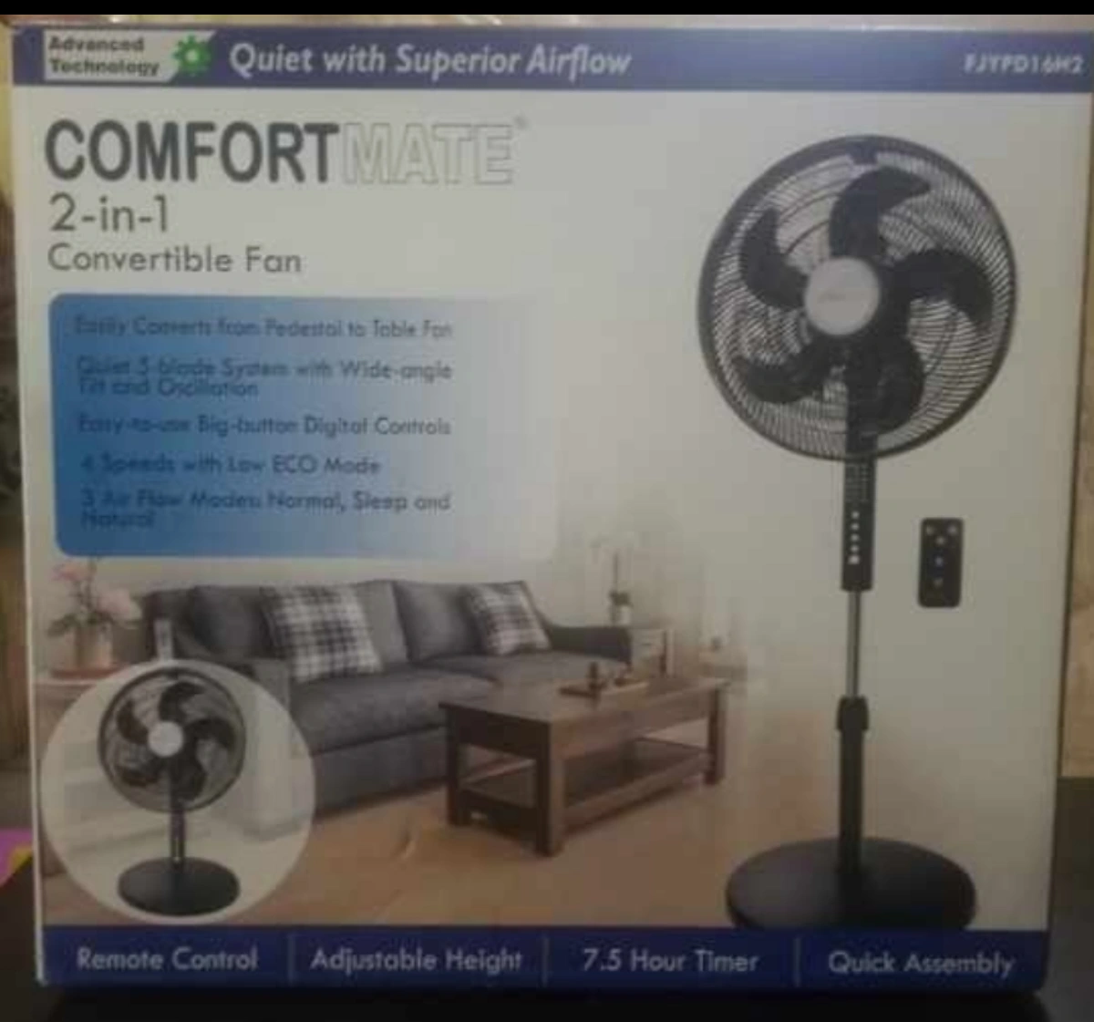 86New in box Black Comfortmate 2-in-1 convertible fan. Easily converts from pedestal to table fan. Features a quiet 3-blade system, wide-angle oscillation, and easy-to-use big-button digital controls. Includes remote control, adjustable height, and 7.5-hour timer. Quick assembly. Have 4 available (2 Sold) $40 per fan
