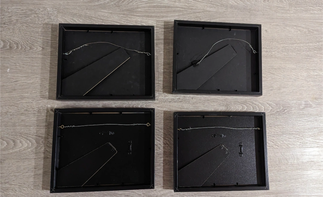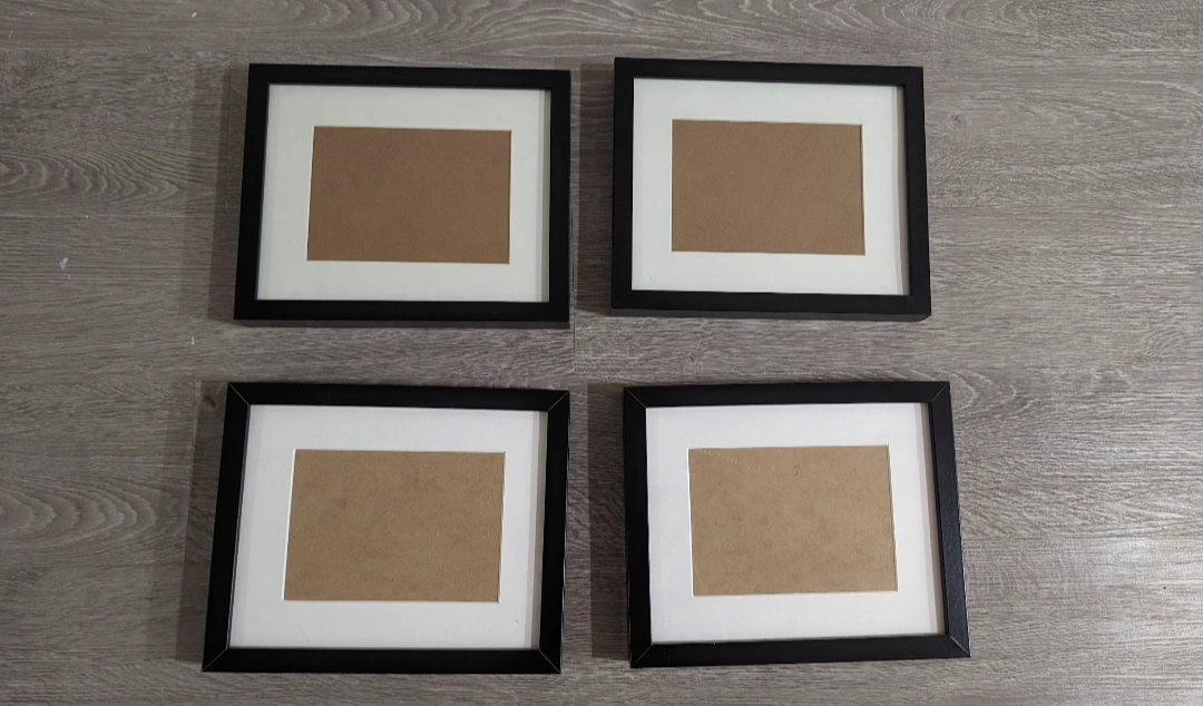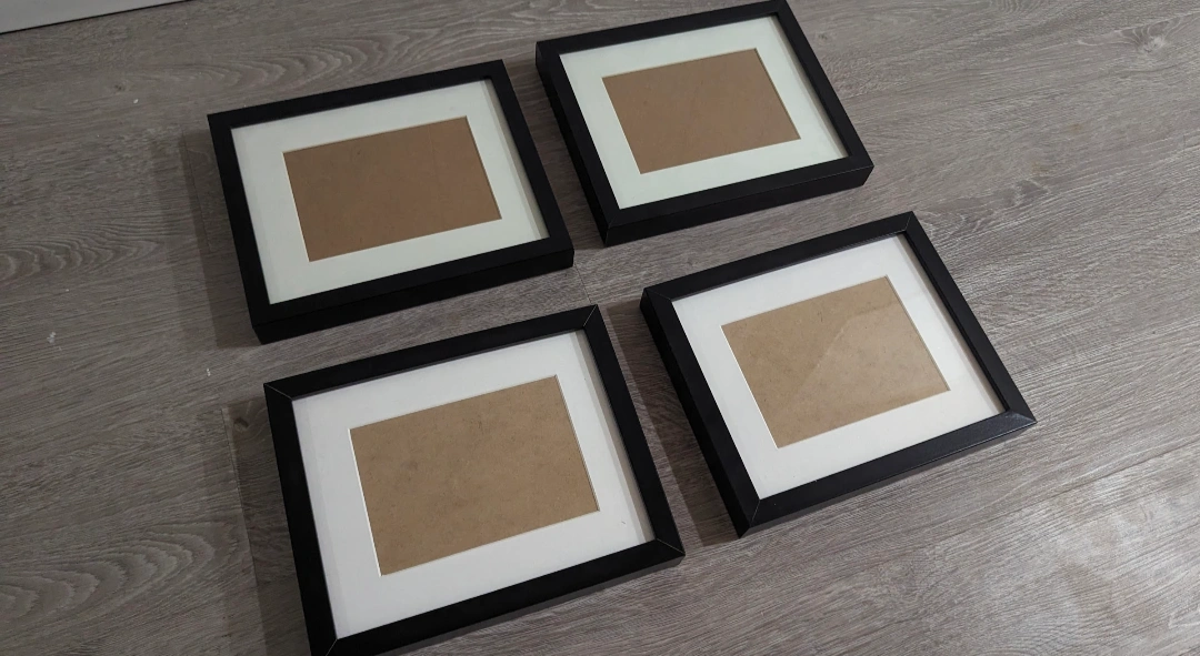 Selling a set of four picture frames! They're in great condition and ready to display your favourite photos or artwork. They have a black frame and a white mat.