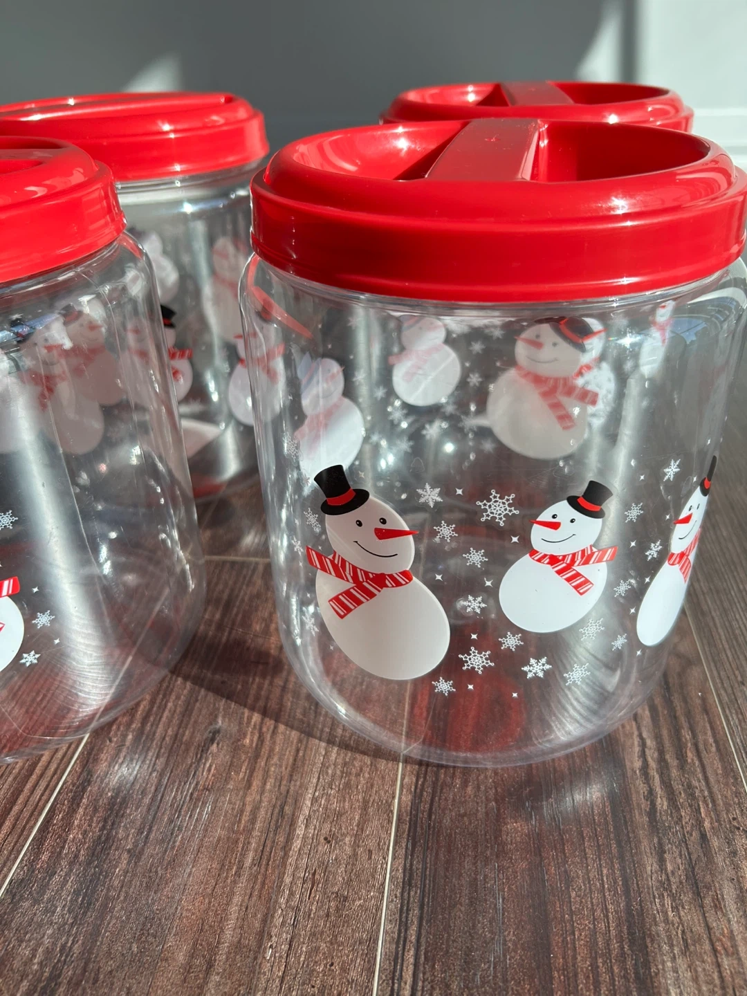 44Selling a set of 4 plastic food storage containers, perfect for Christmas baking or storing leftovers! They're clear with a cute snowman design and a bright red lid. Great for keeping your goodies fresh during the holidays. Capacity 2kg