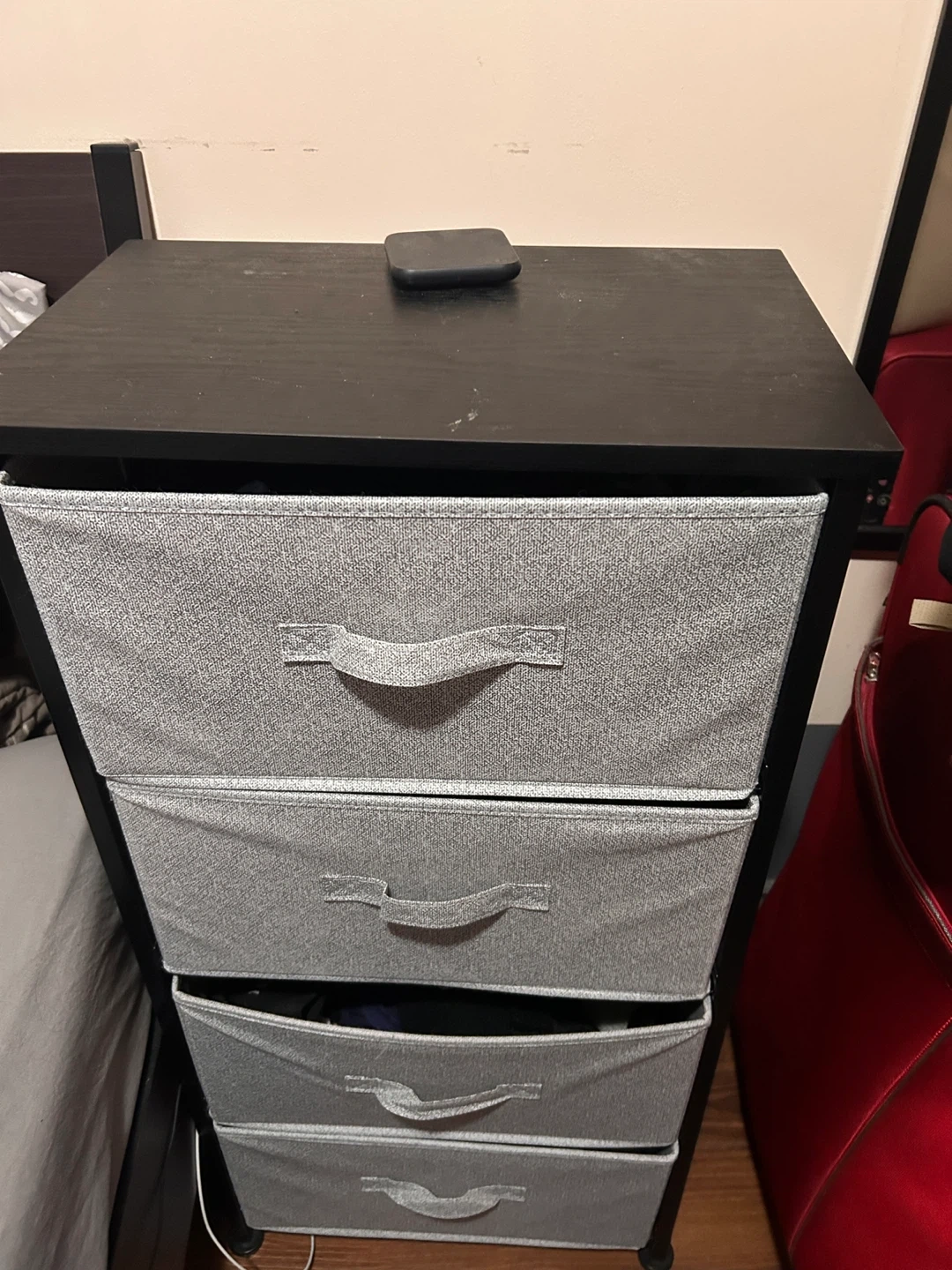 65Selling a handy storage tower with four drawers! It has a black metal frame and light grey fabric bins. Perfect for organizing clothes, accessories, or anything else you need to keep tidy. The drawers are easy to pull out and provide lots of storage space